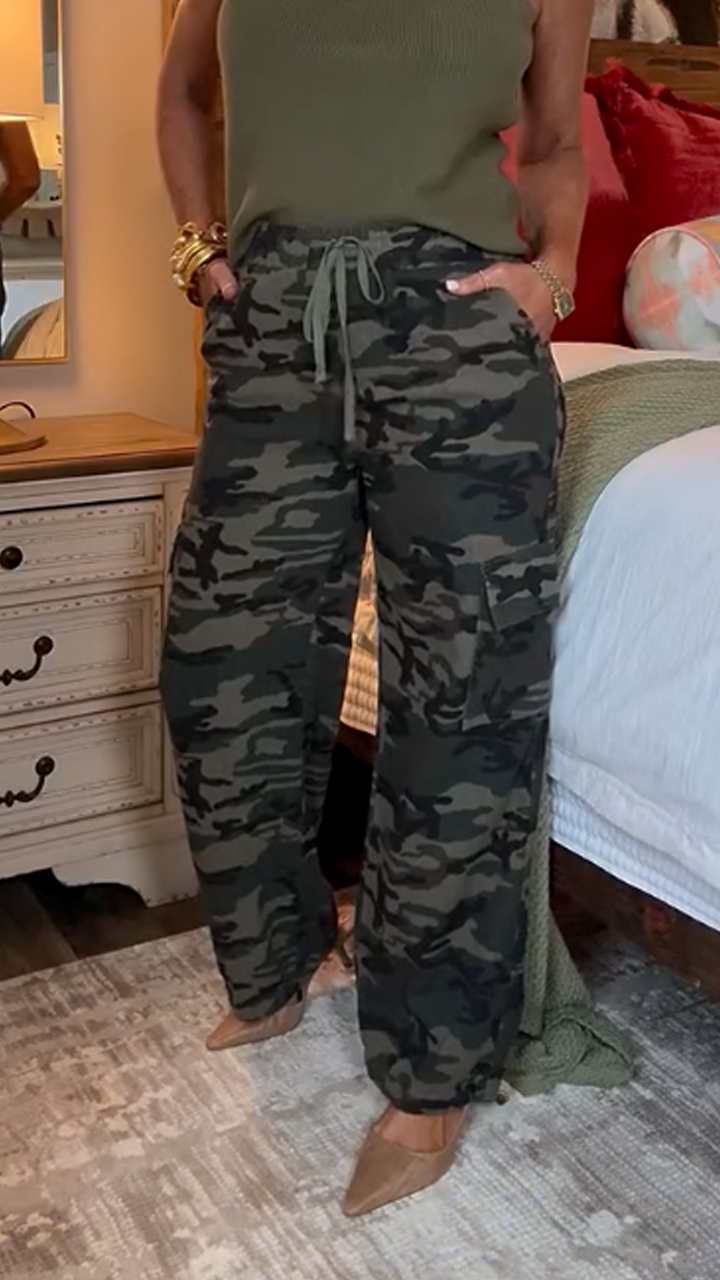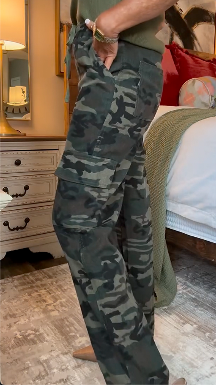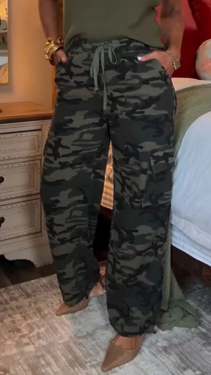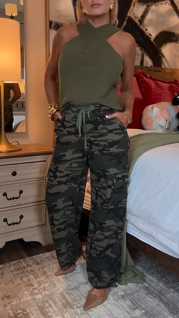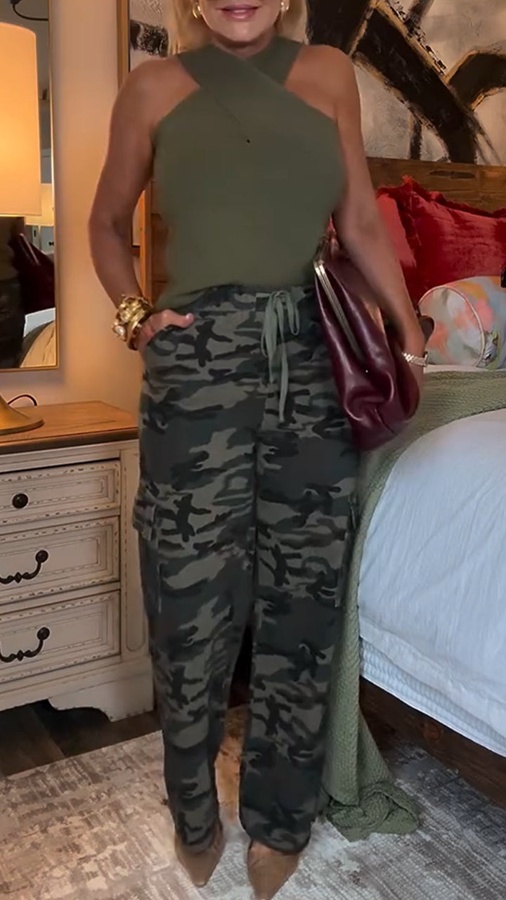 Ladies Round Neck Cross Top+ Camouflage Pants Casual Set
