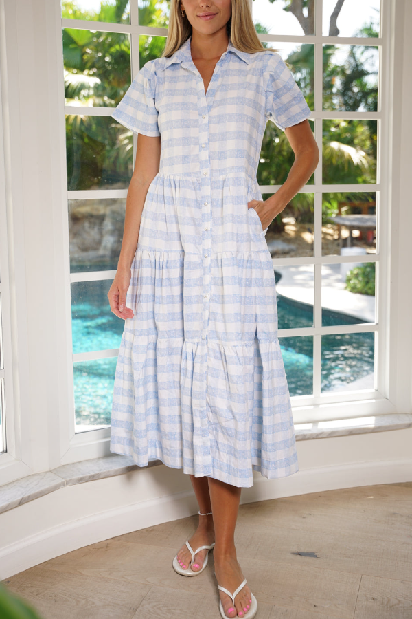 V-Neck Short-Sleeve Check Dress