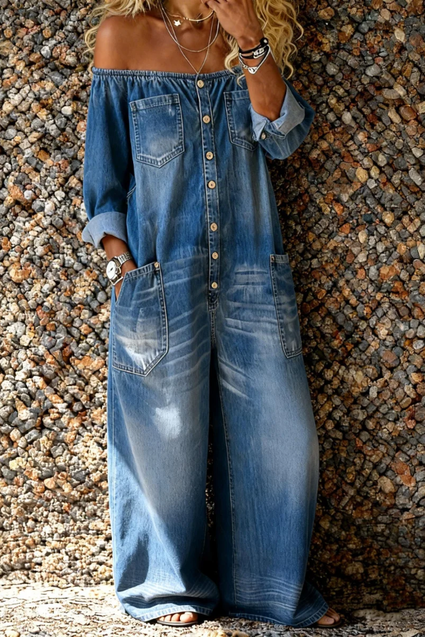 Women's Casual Long-sleeved Washed Cotton Denim Jumpsuit