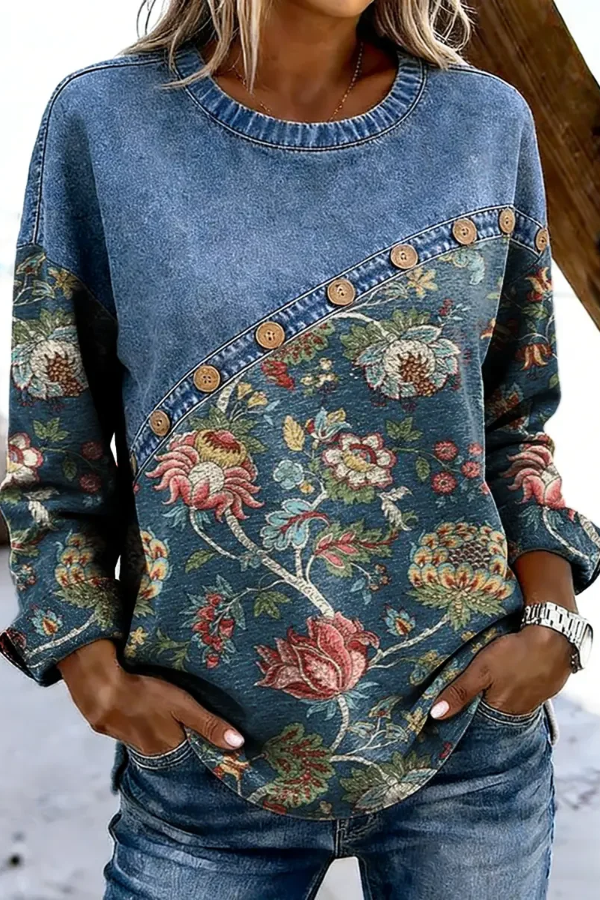 Women's Folk Floral Print Crew Neck Denim Button Patchwork Sweatshirt