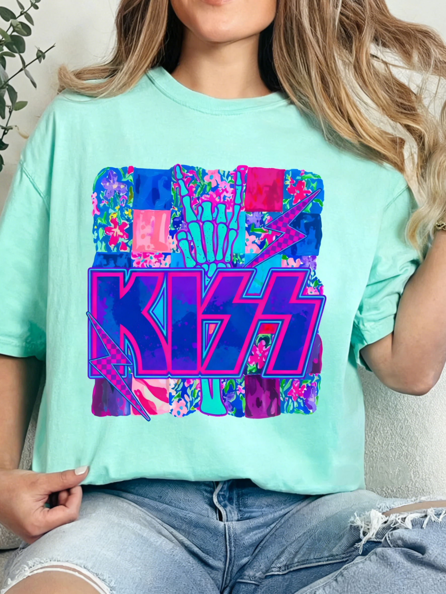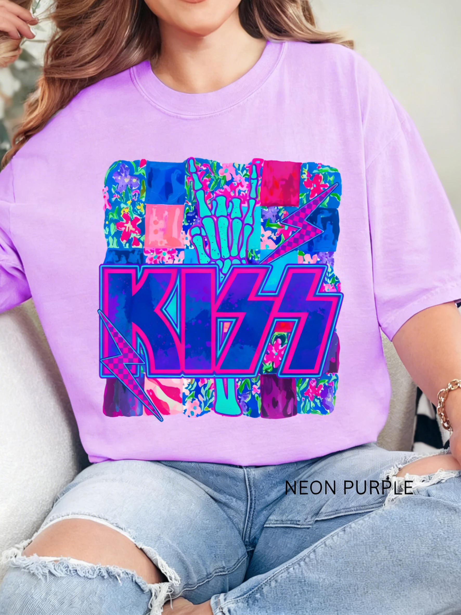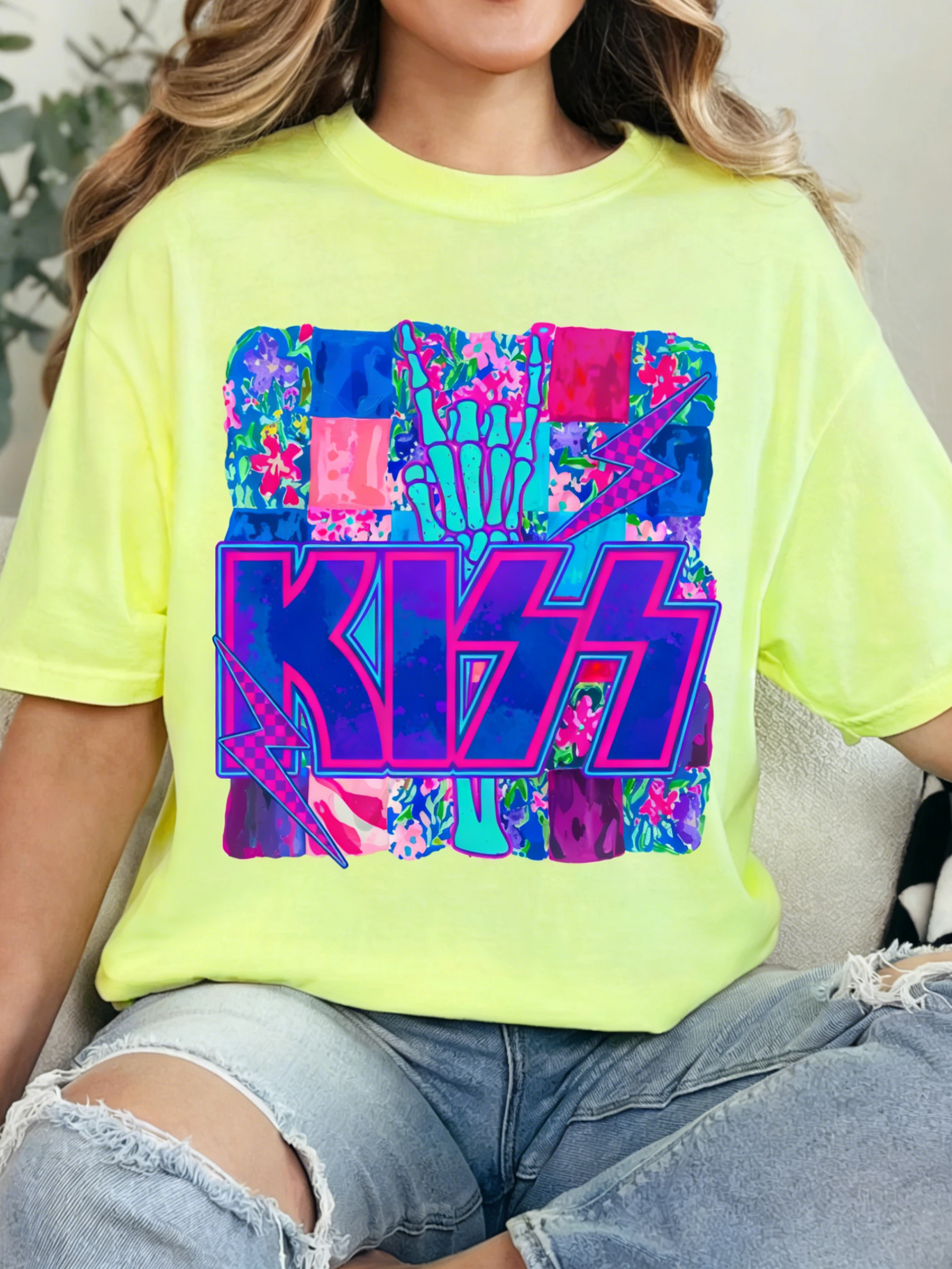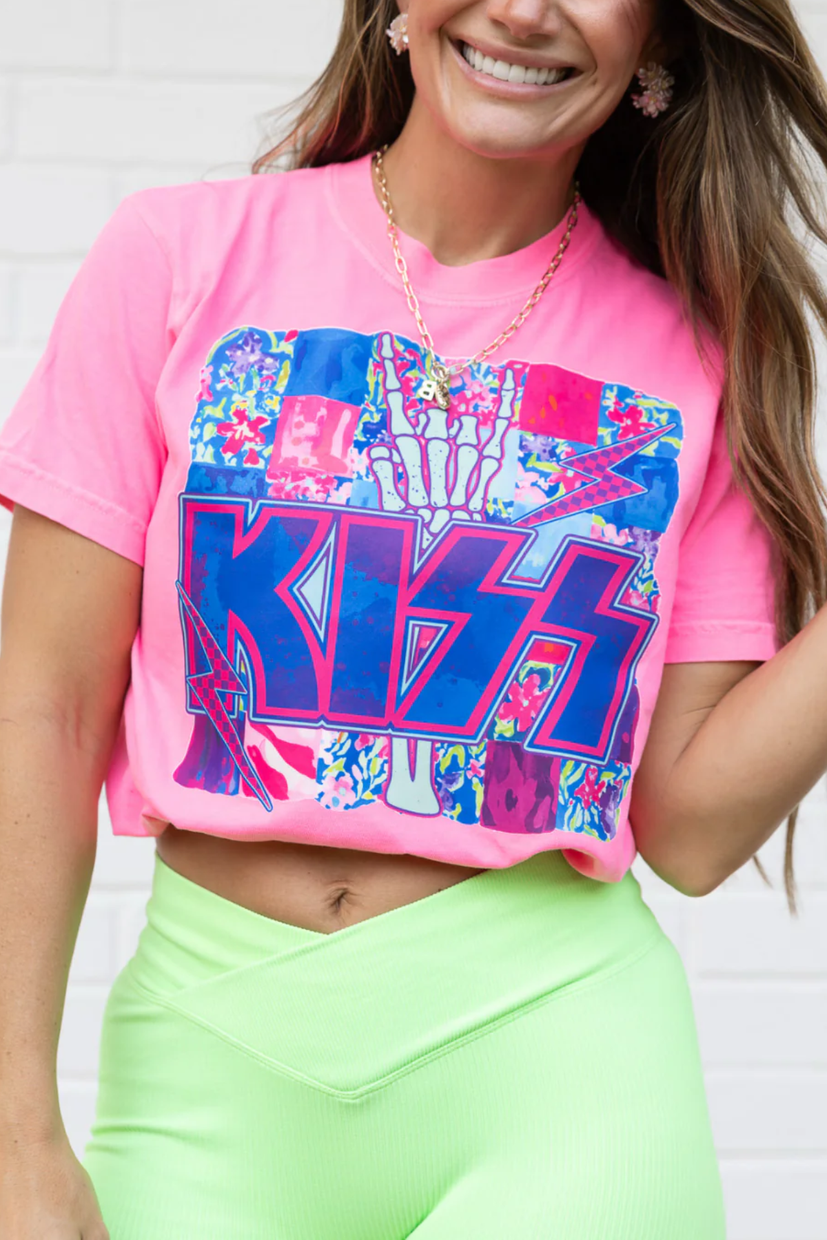 This Neon KISS Band T-Shirt amps up retro rock style with bold, playful flair: its vivid neon pink base features the iconic KISS logo, paired with vibrant floral prints and graphic accents (including a skeleton hand detail). The cropped, relaxed fit keeps it comfy and on-trend—perfect for adding a nostalgic, eye-catching pop to your casual outfits.
