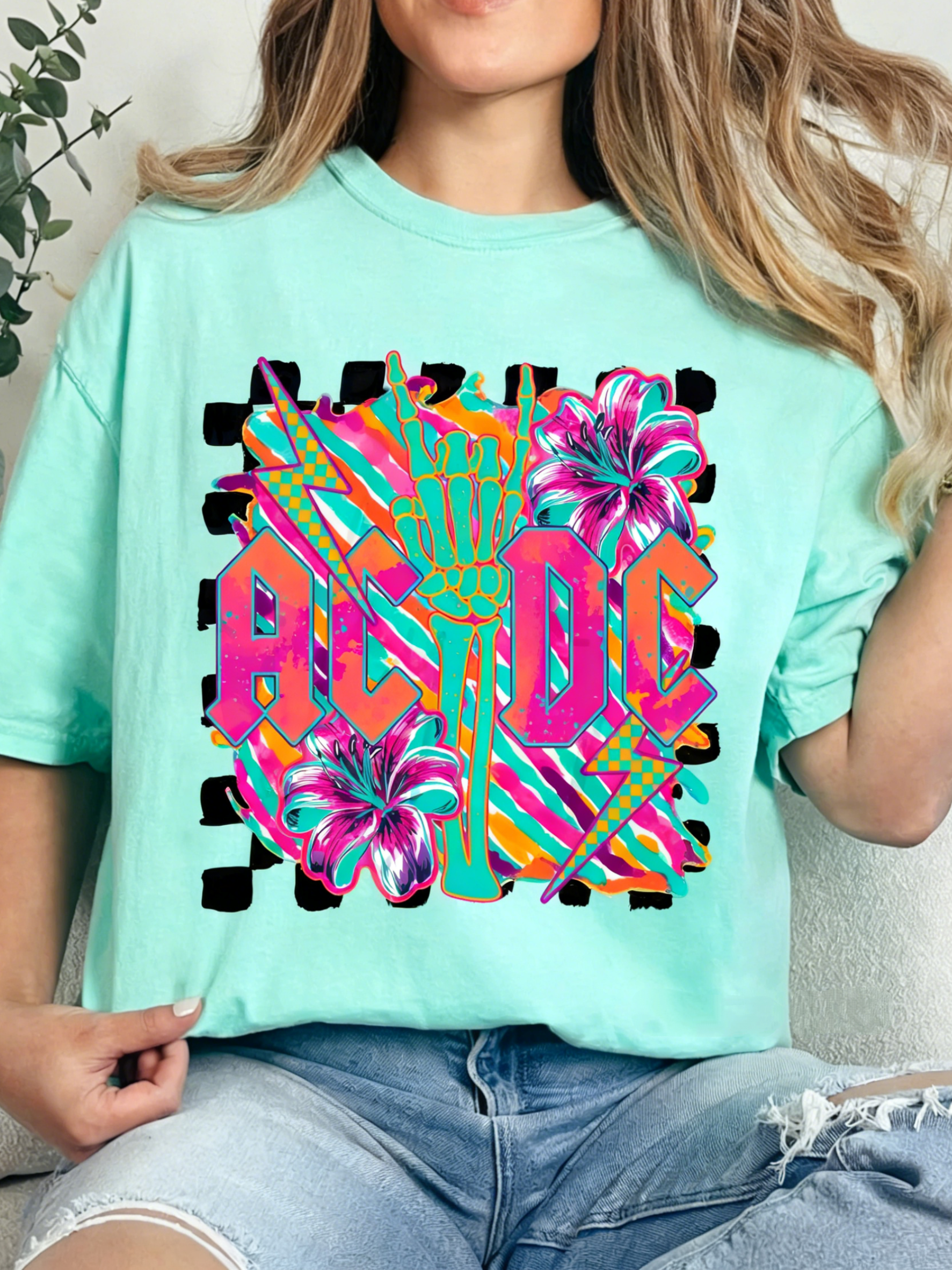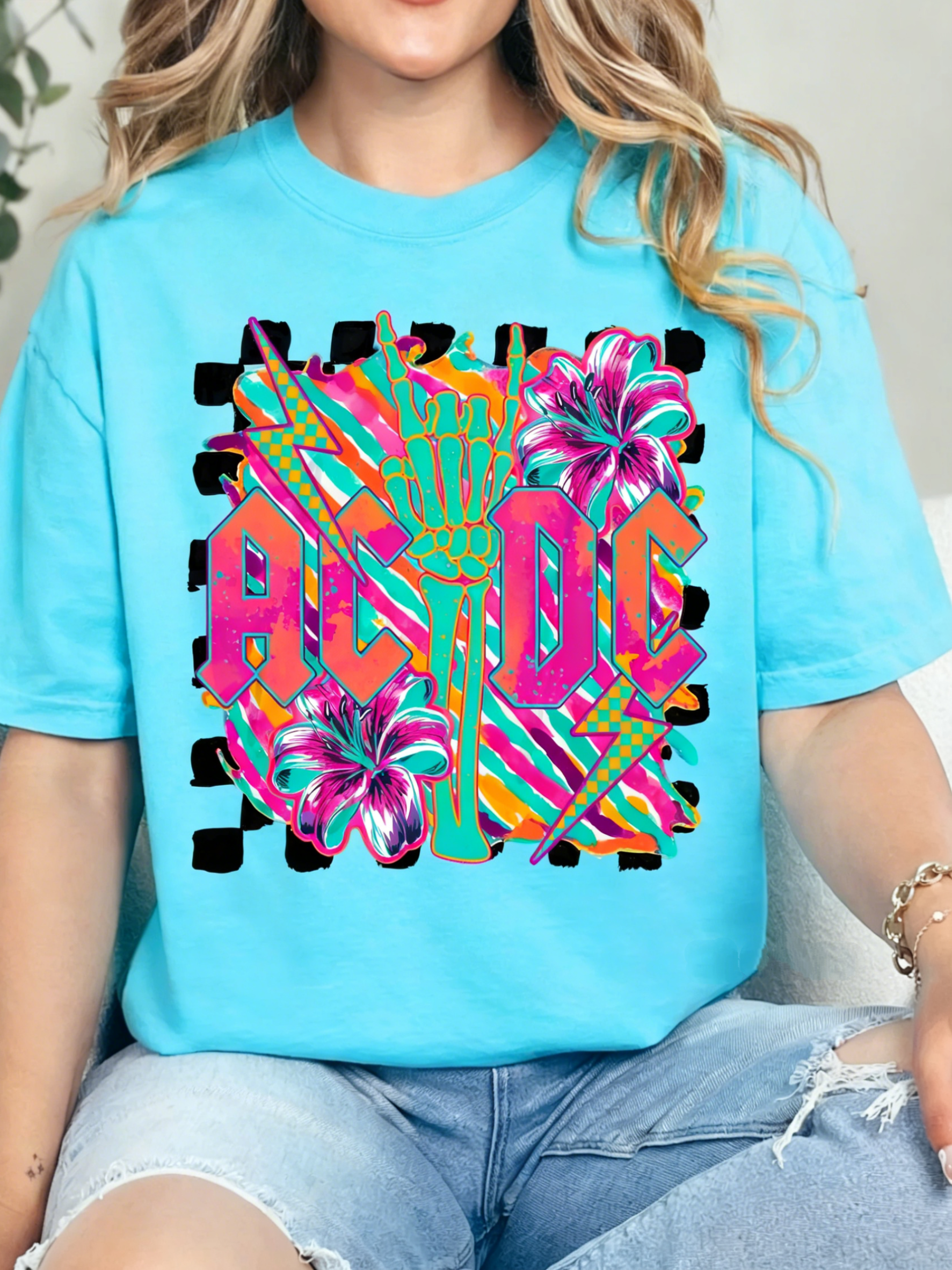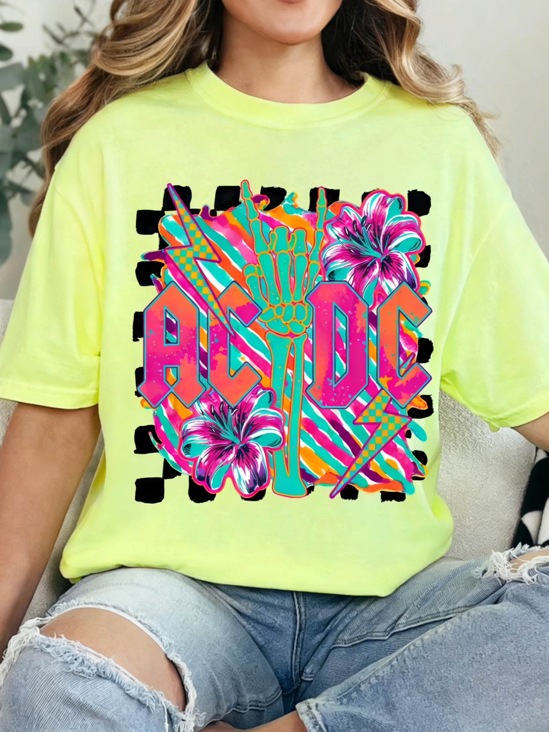 This Neon AC/DC Band T-Shirt blends rock 'n' roll edge with vibrant retro flair: its soft mint base is topped with a bold, neon-splashed AC/DC graphic (paired with tropical florals and electric accents). The cropped, oversized fit keeps it playful and comfy—ideal for adding a nostalgic, eye-catching pop to your casual looks.