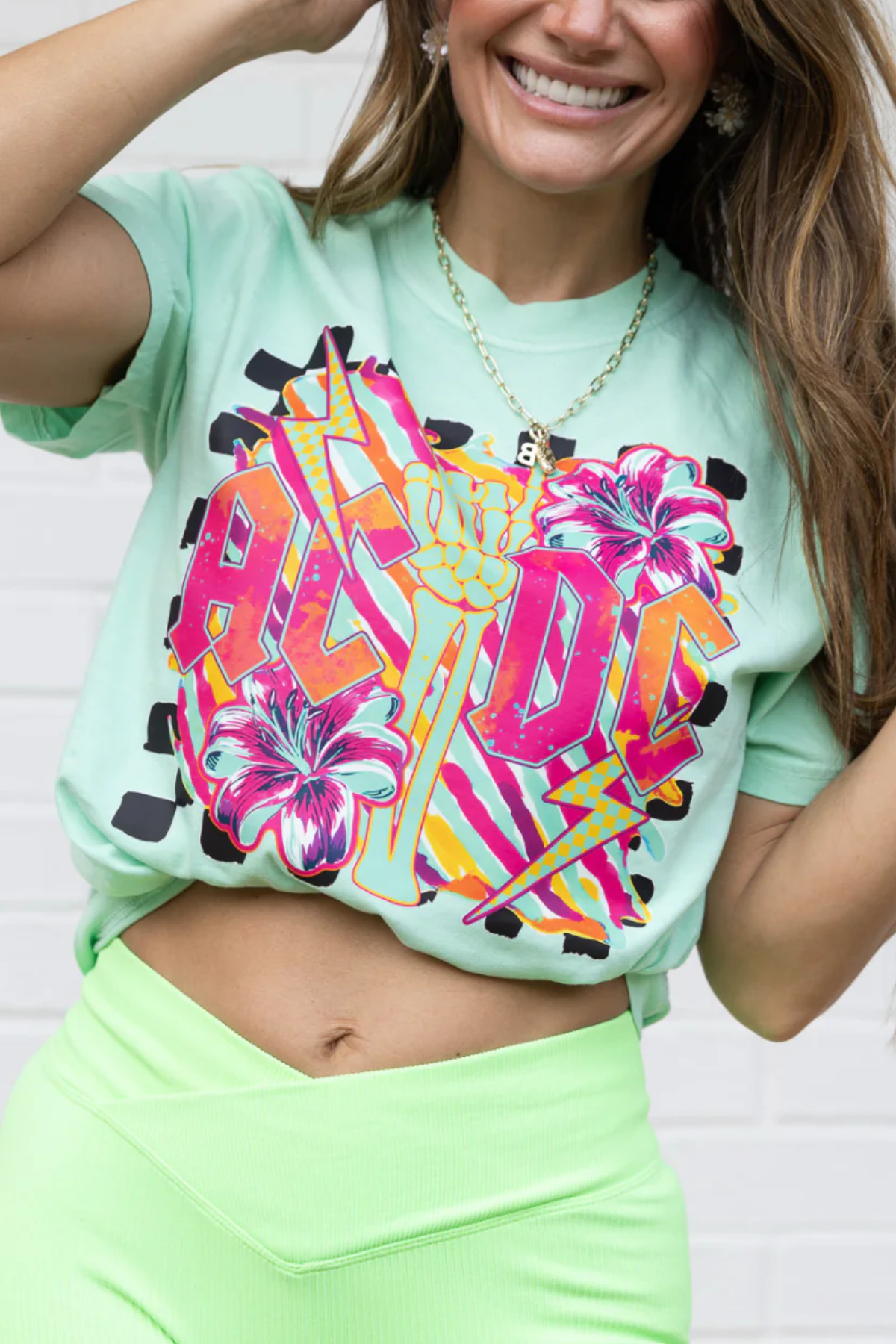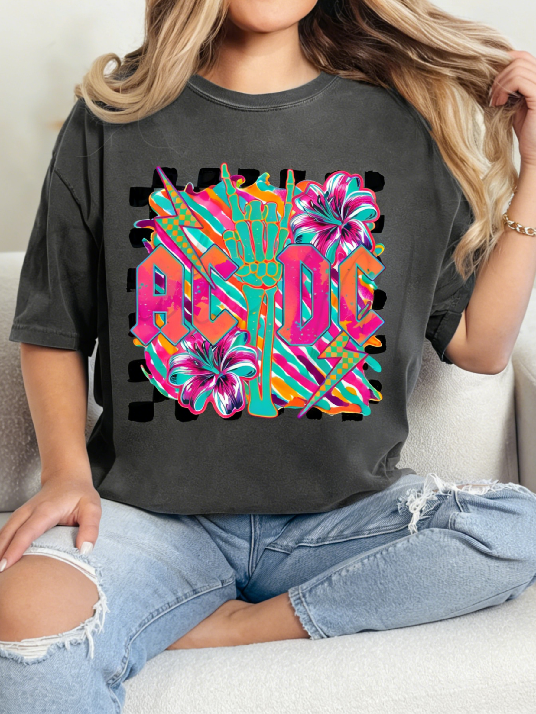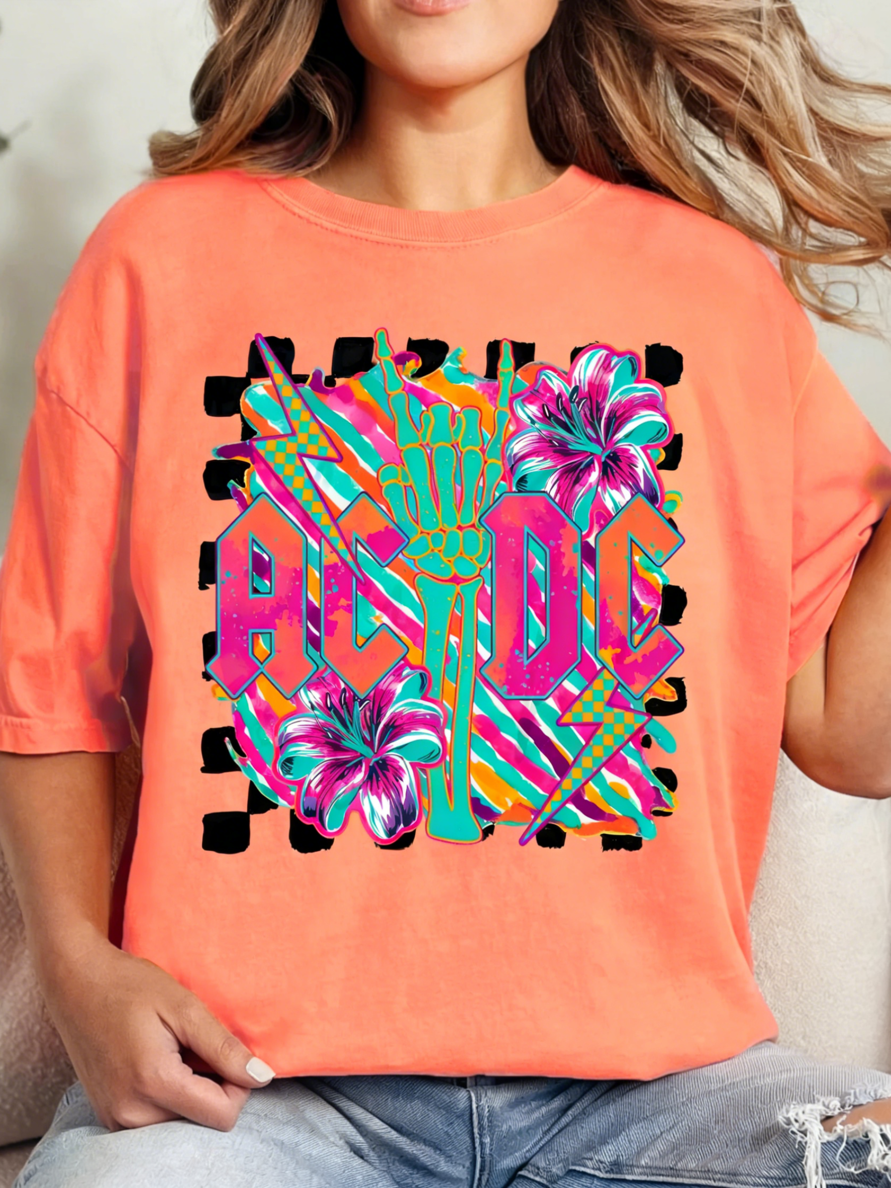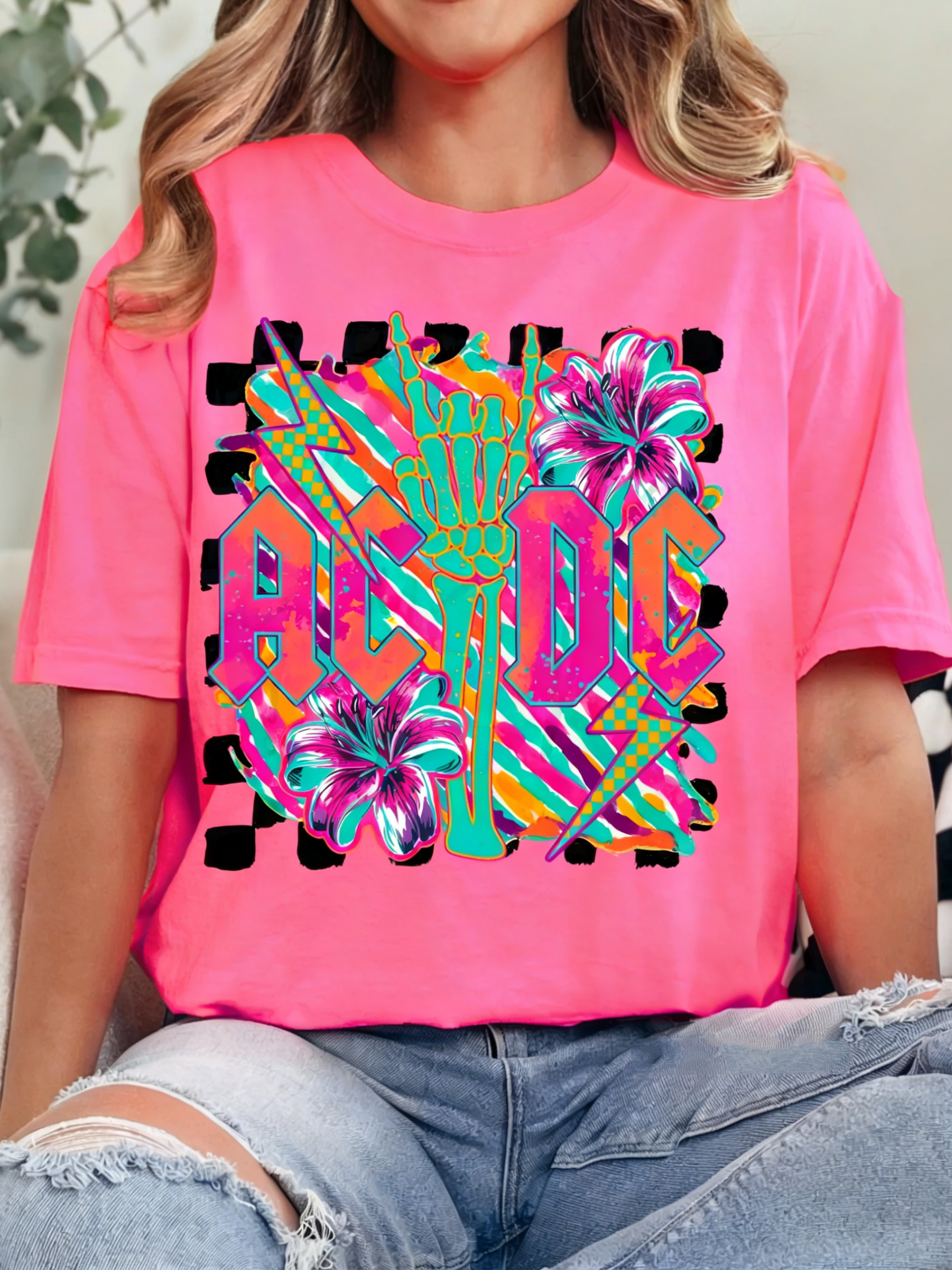 This Neon AC/DC Band T-Shirt blends rock 'n' roll edge with vibrant retro flair: its soft mint base is topped with a bold, neon-splashed AC/DC graphic (paired with tropical florals and electric accents). The cropped, oversized fit keeps it playful and comfy—ideal for adding a nostalgic, eye-catching pop to your casual looks.