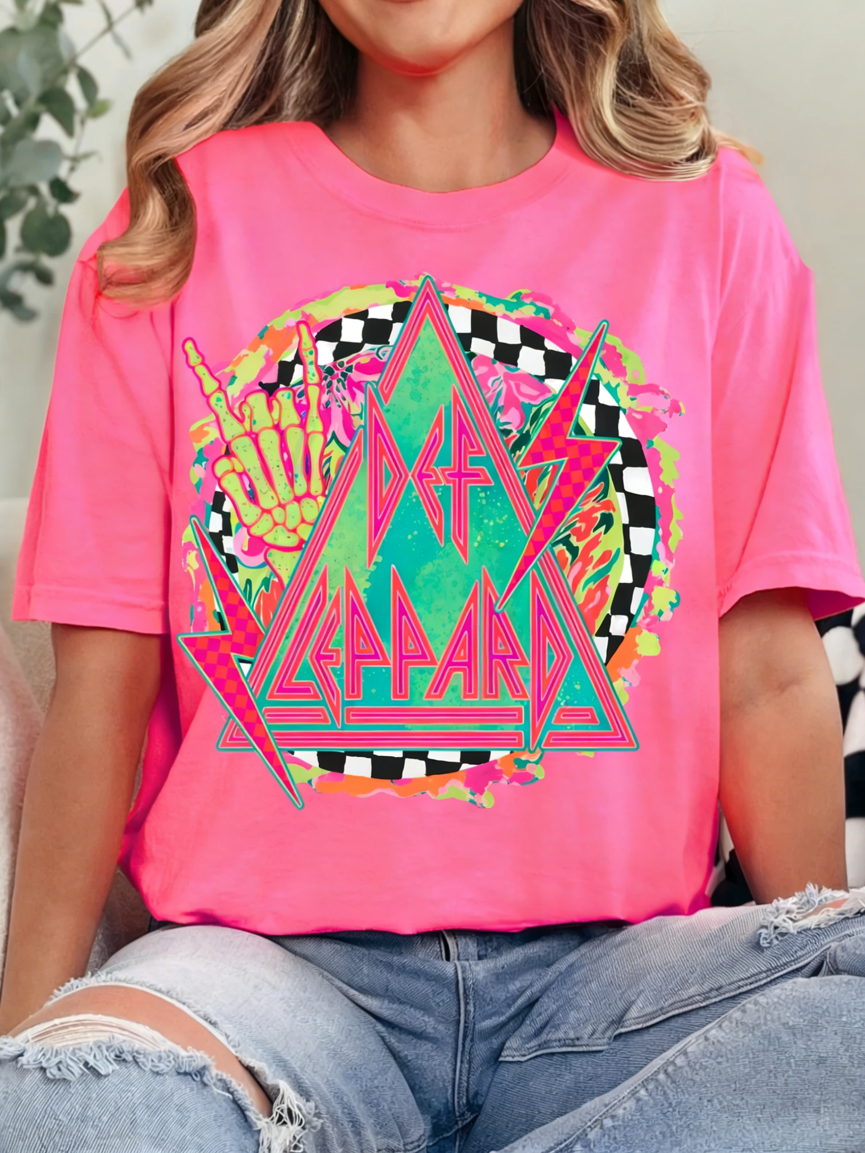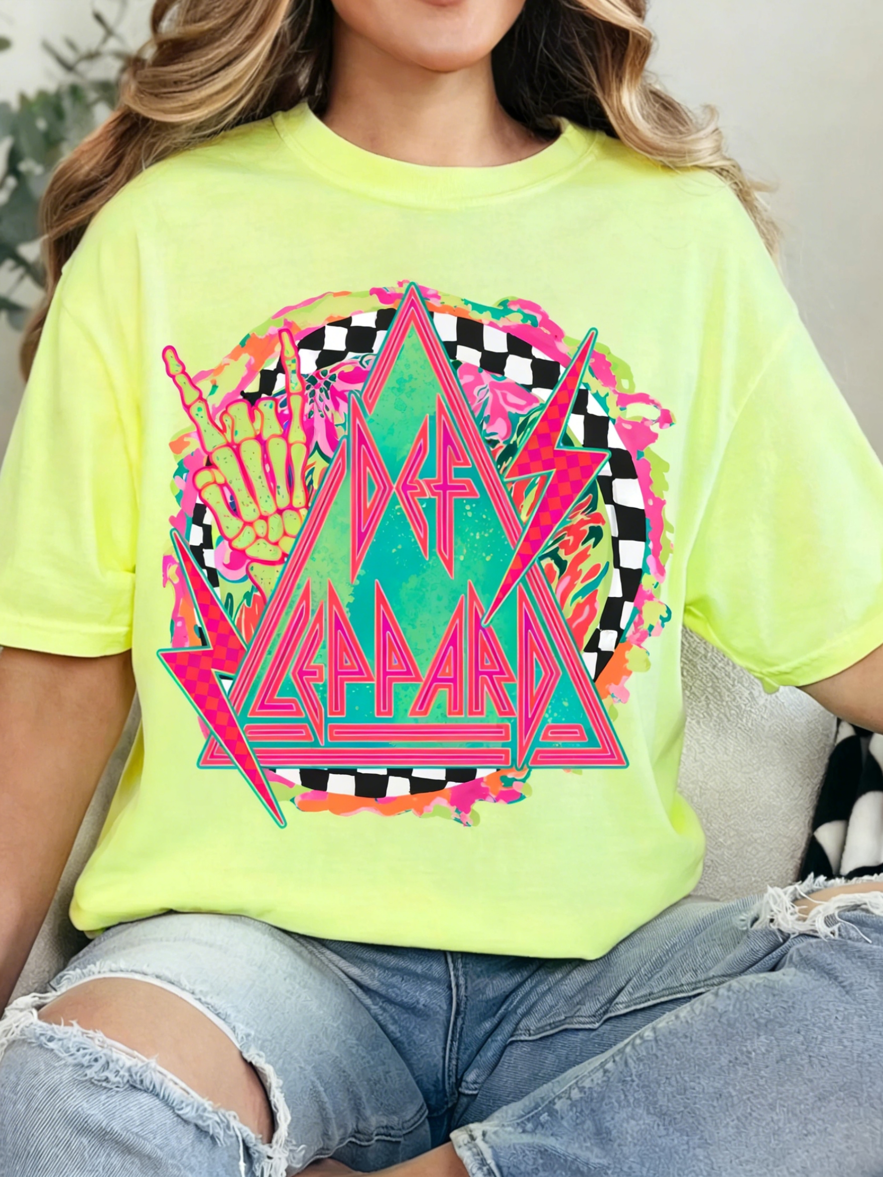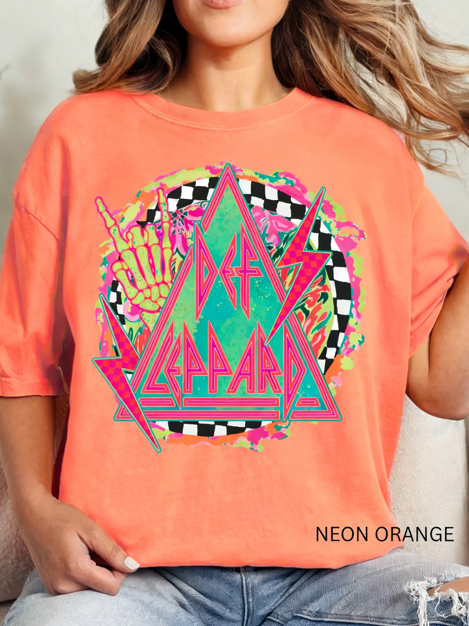 This Neon Def Leppard Band T-Shirt cranks up 80s hair-metal energy: its bright tangerine base features the band’s iconic pyramid logo, paired with a neon-splashed graphic (including a skeleton hand, checkered accents, and vibrant swirls). The cropped, relaxed fit keeps it playful and comfy—ideal for adding a nostalgic, eye-catching pop to your casual rock-inspired outfits.