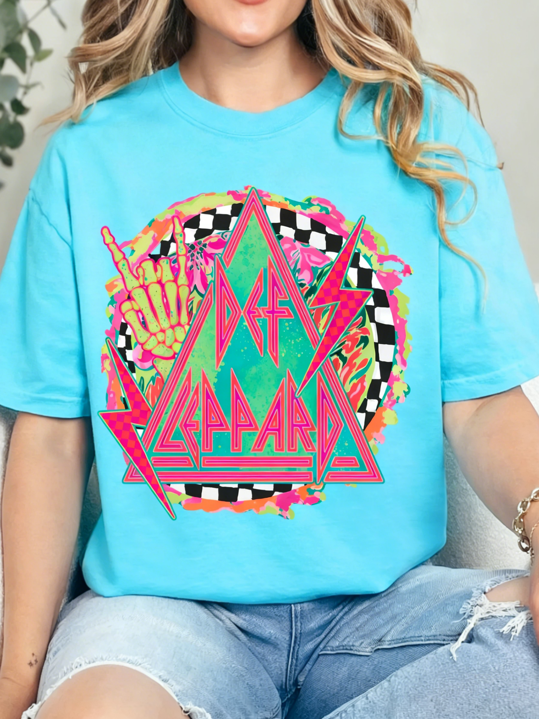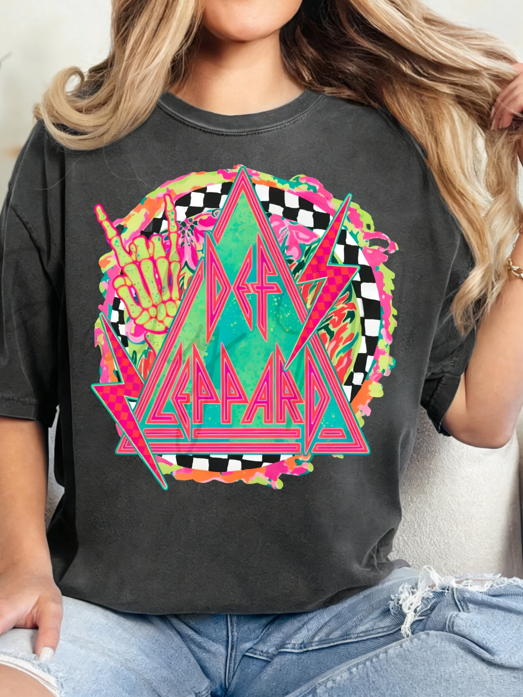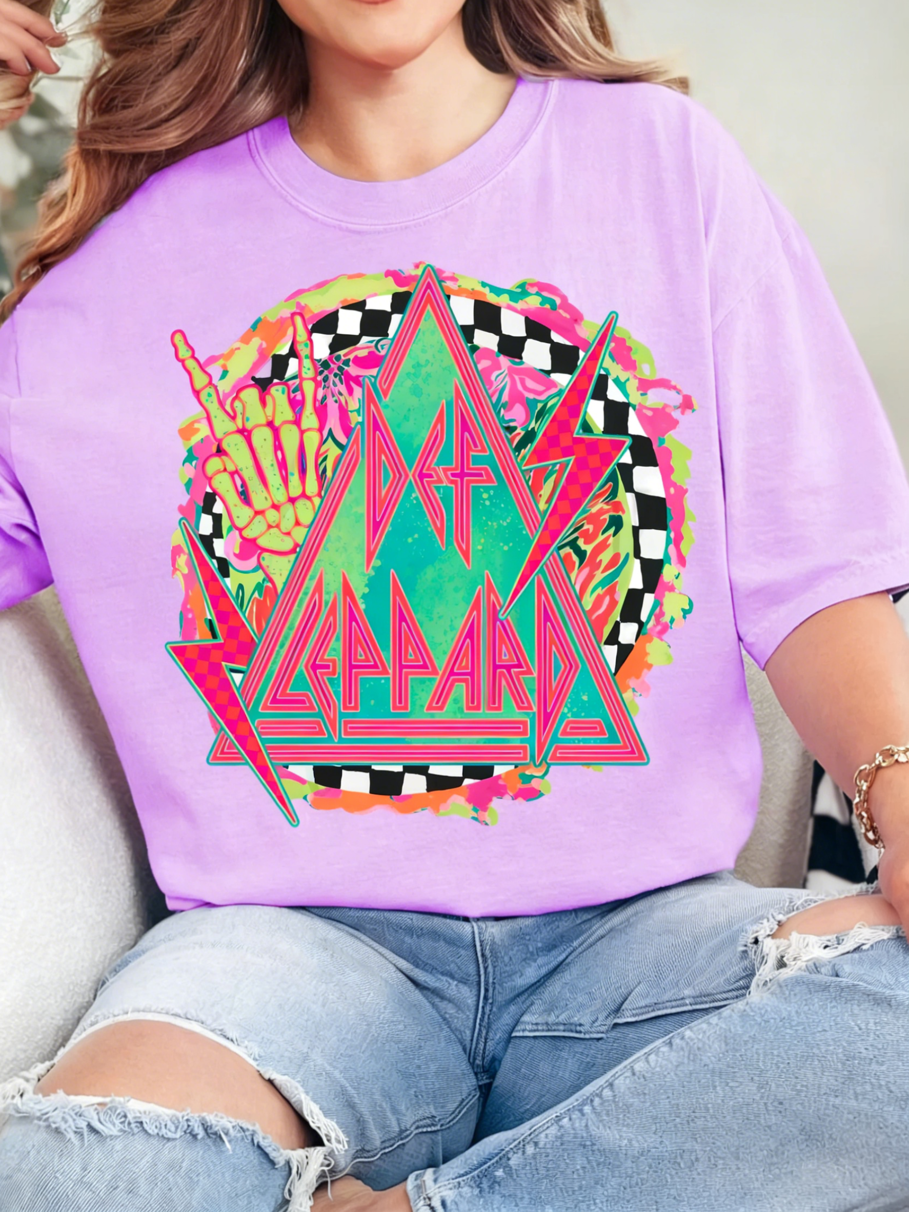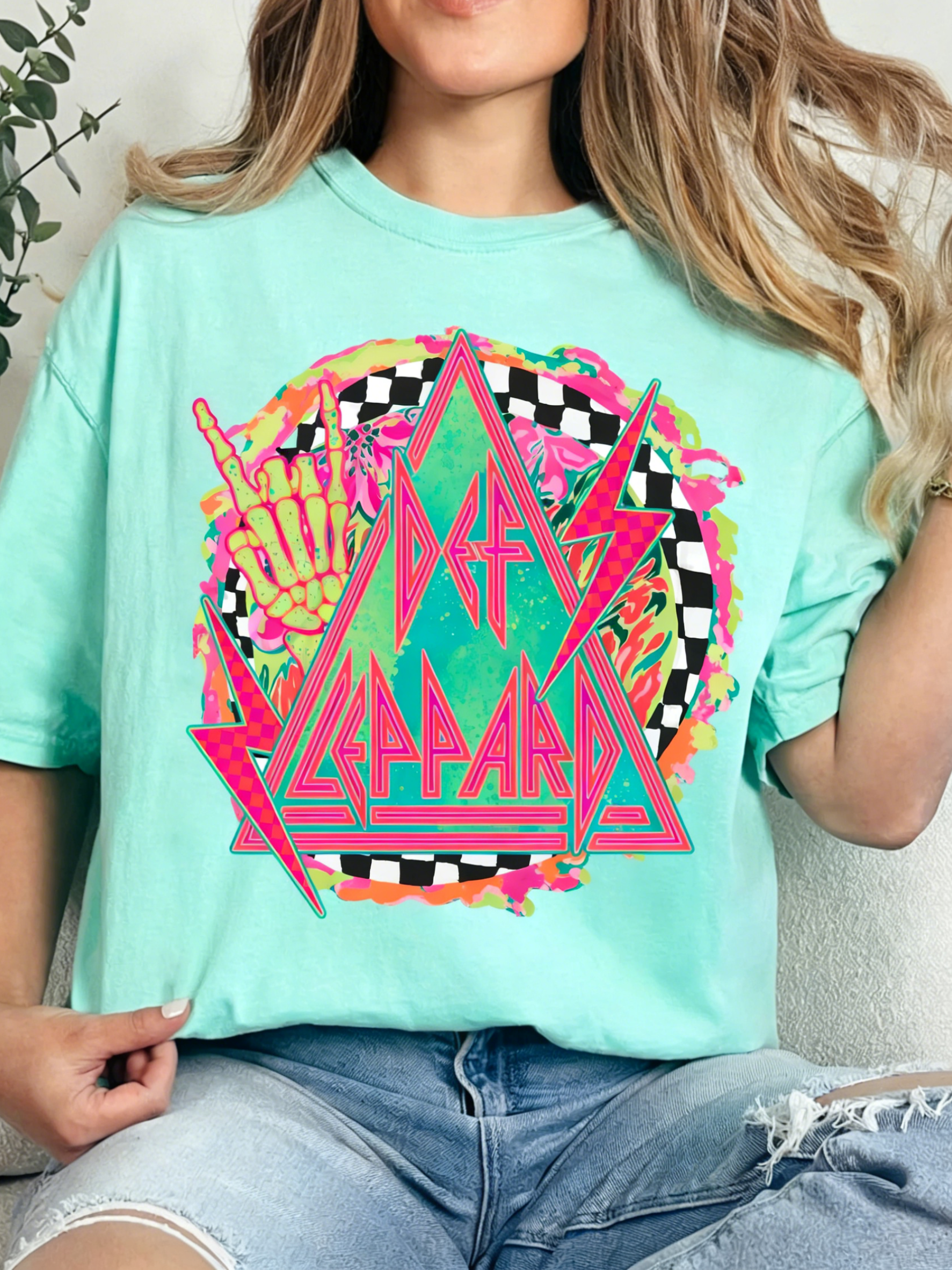This Neon Def Leppard Band T-Shirt cranks up 80s hair-metal energy: its bright tangerine base features the band’s iconic pyramid logo, paired with a neon-splashed graphic (including a skeleton hand, checkered accents, and vibrant swirls). The cropped, relaxed fit keeps it playful and comfy—ideal for adding a nostalgic, eye-catching pop to your casual rock-inspired outfits.