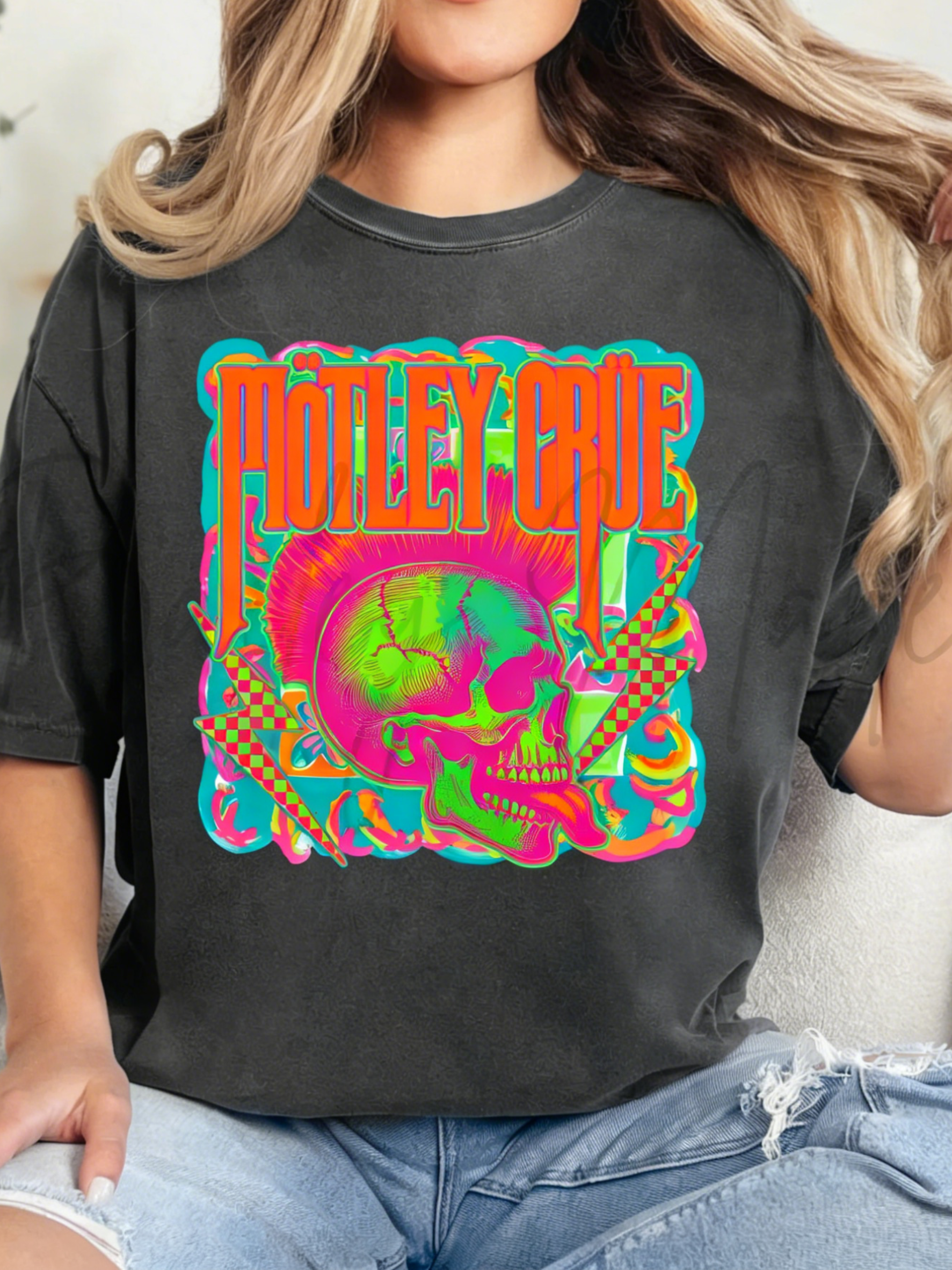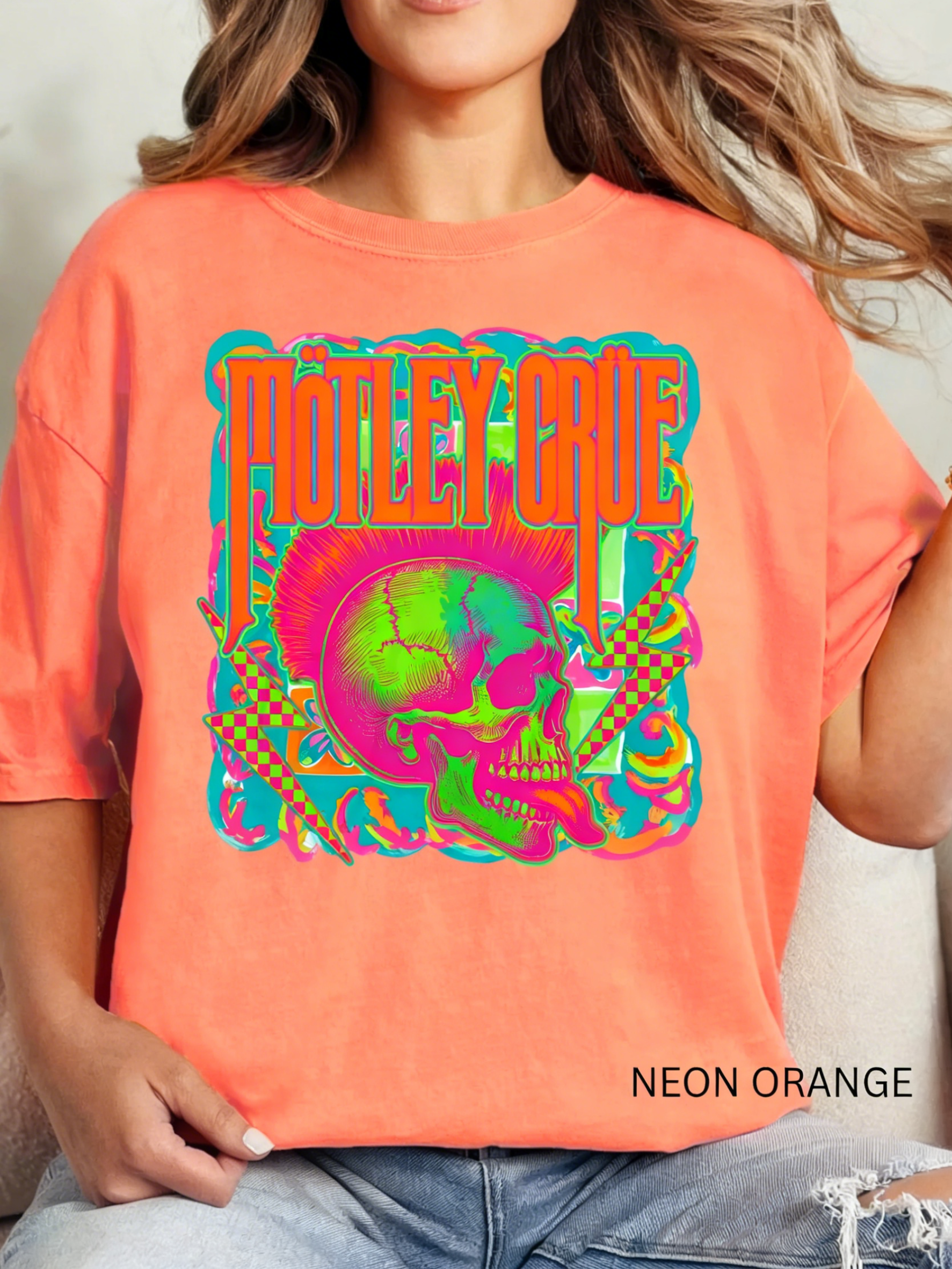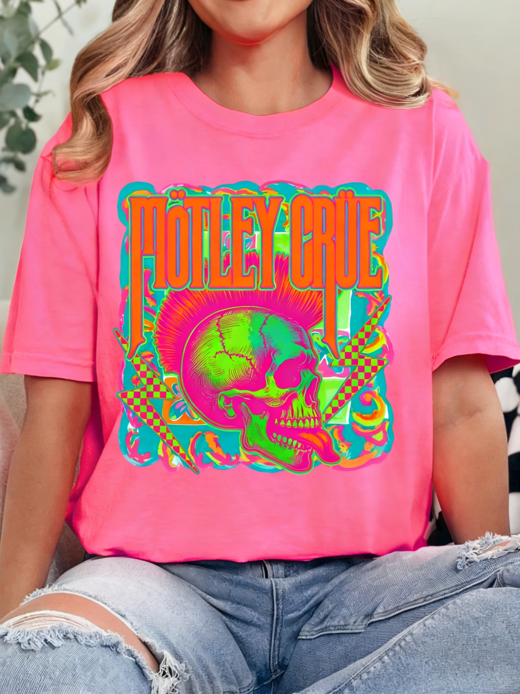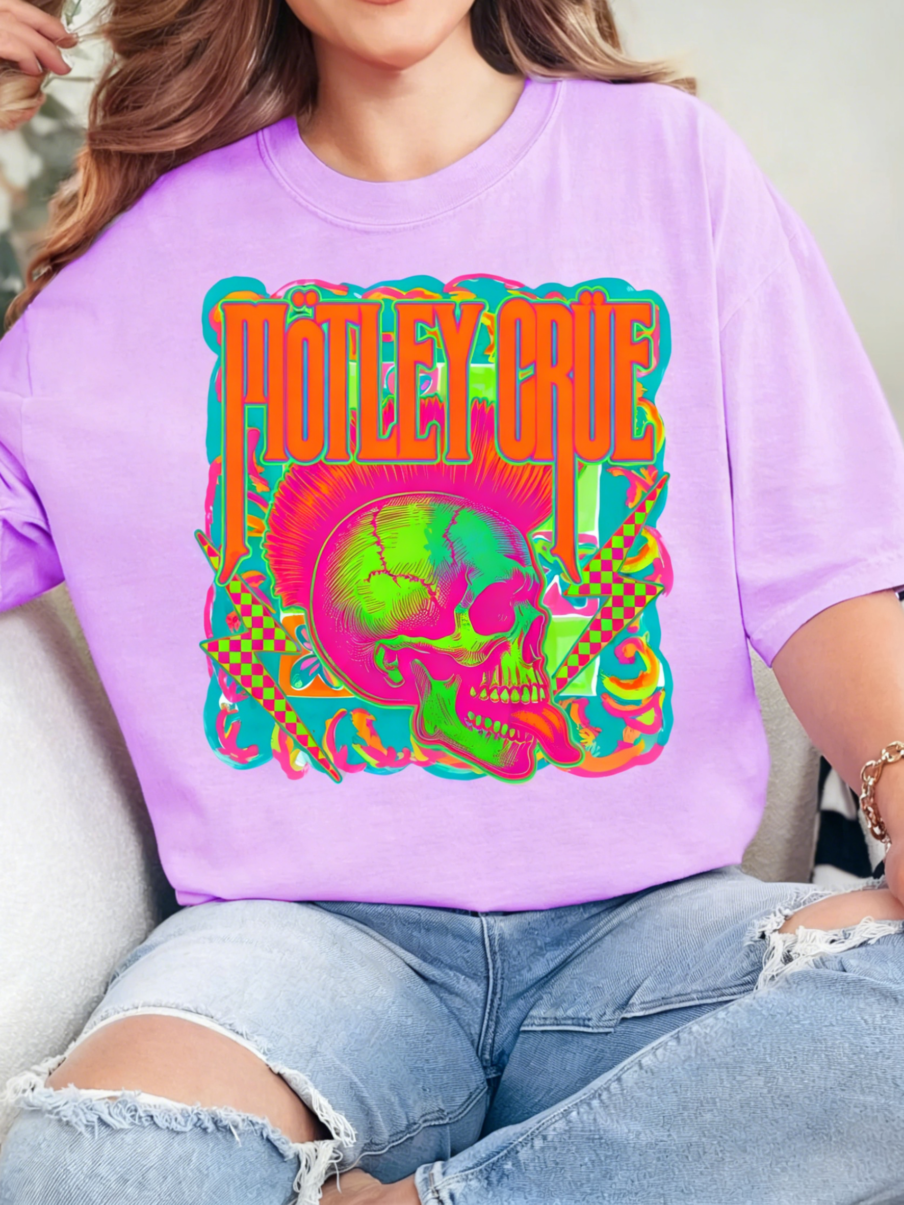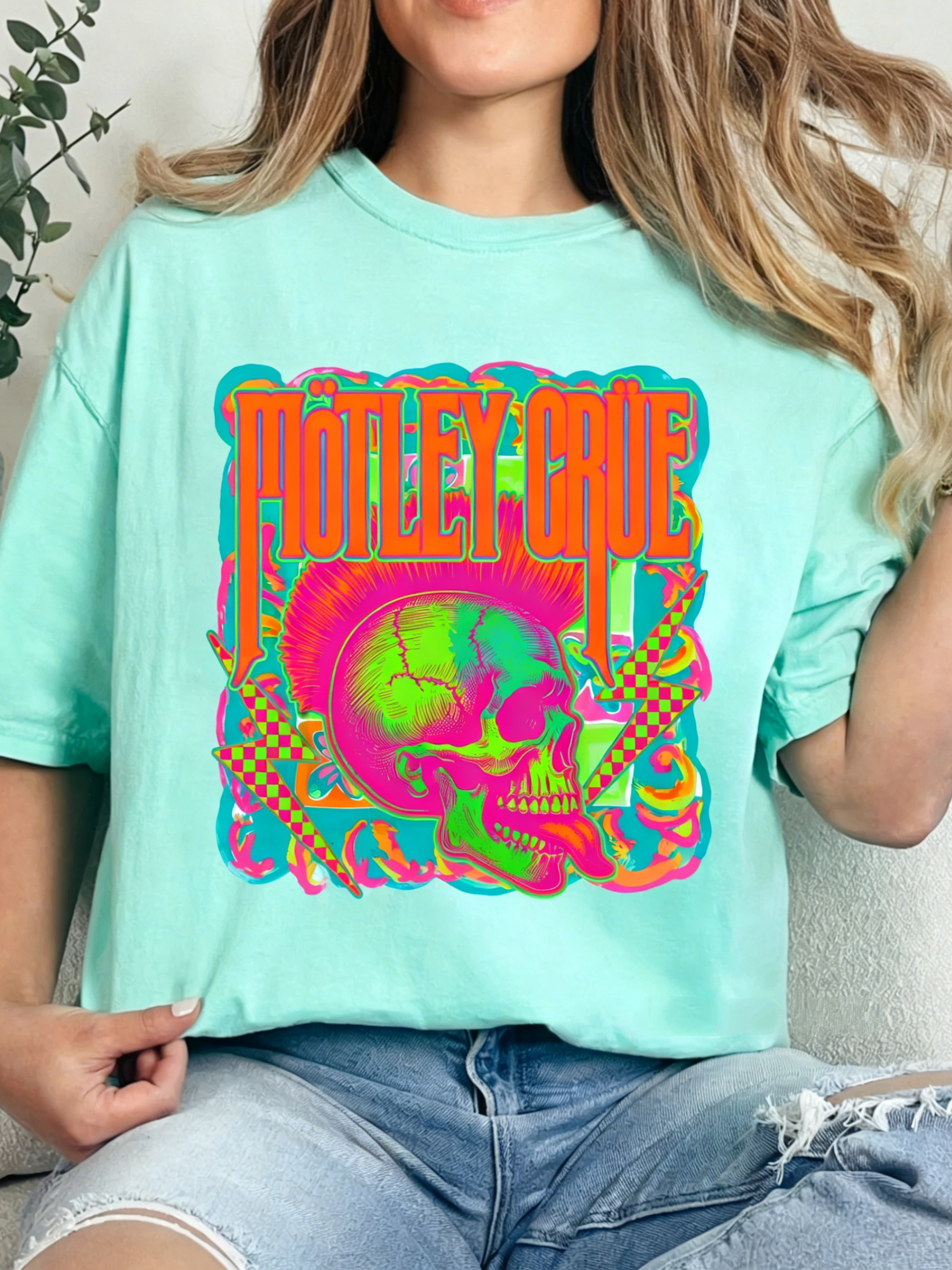 This Neon Mötley Crüe Band T-Shirt serves up bold hair-metal energy: its soft "Island Reef" mint base features the iconic band logo paired with a neon skull graphic (accents of pink, green, and checkered lightning bolts). The oversized, relaxed fit keeps it comfy and edgy—ideal for adding a nostalgic, eye-catching pop to your casual rock-inspired looks.