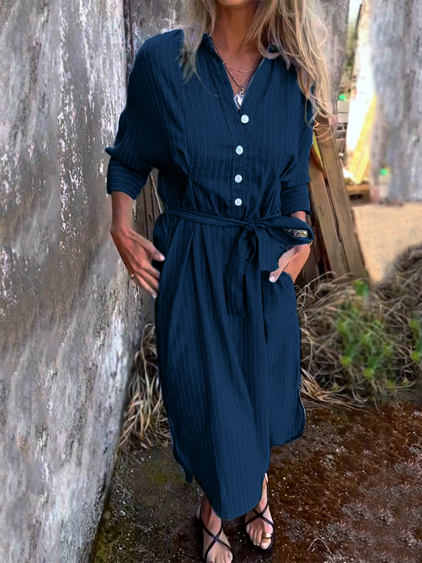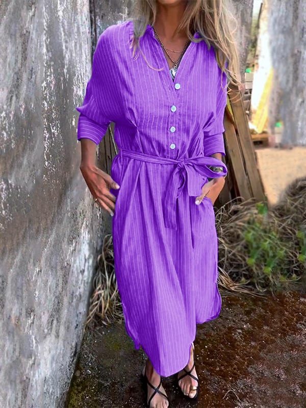 The Striped Lapel Button Down Belt Dress is designed for the modern woman who cares about sophistication and style. The elegant Maxi long dress is perfect for any occasion.