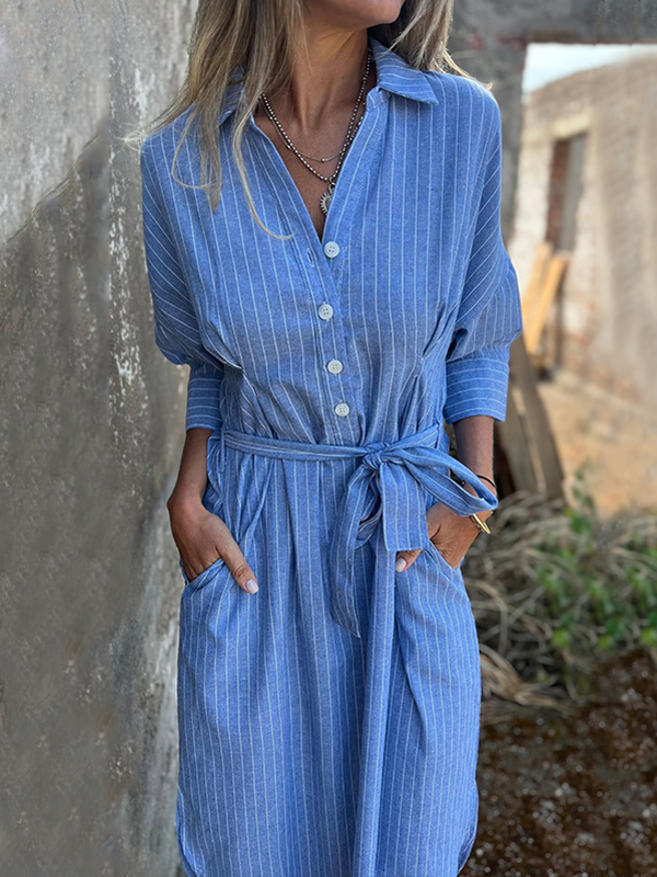 Timeless Elegance: Striped Lapel Button Down Belt Dress