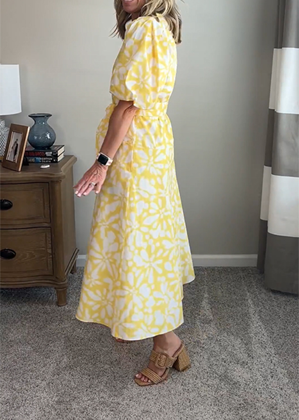 NEW🔥 V Neck Bubble Sleeve Printed Belted Dress