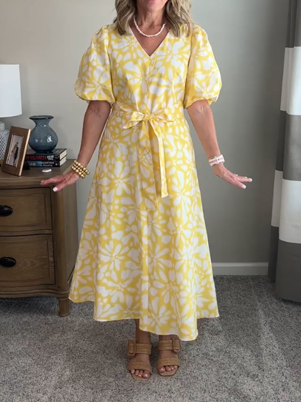Timeless Elegance: V Neck Bubble Sleeve Printed Belted Dress