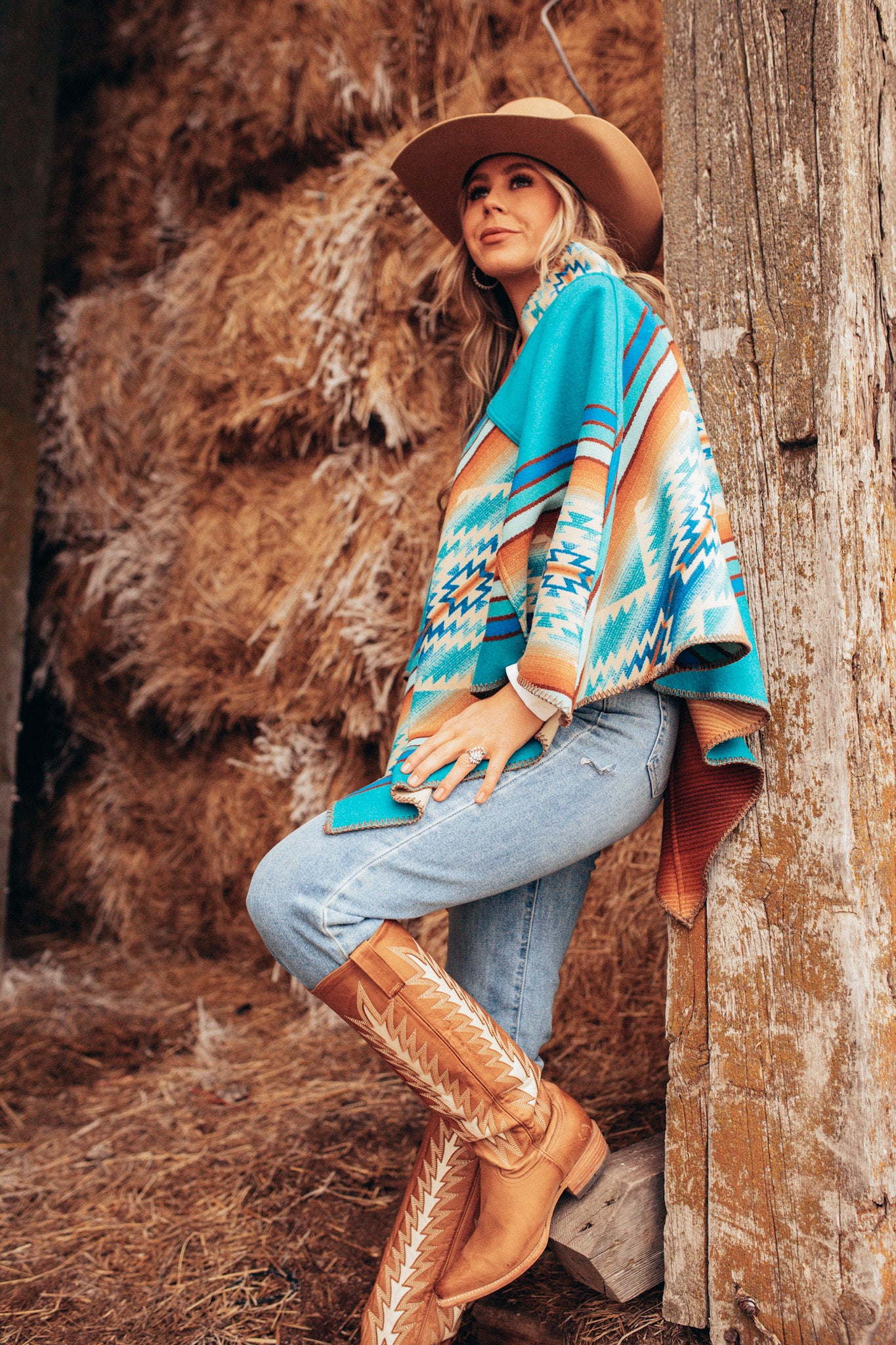 this poncho highlights the Pagosa design representing hot blue springs where Southern California Utes were known to bathe, rising through fire to bring health and peace. Pull this easy poncho over your head and you’re ready to go. Sleeveless and roomy for an easy-to-wear style. Open, breathable style with enough warmth to keep the chill away.