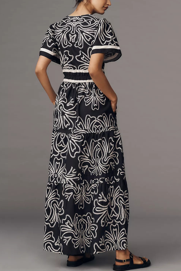 The V-neck design accentuates the neck line, adding an elegant quality; the waist-cinching design highlights the waistline and optimizes the body proportion, making the wearer appear more slender; the layered skirt has a sense of depth, flowing gracefully with movement.