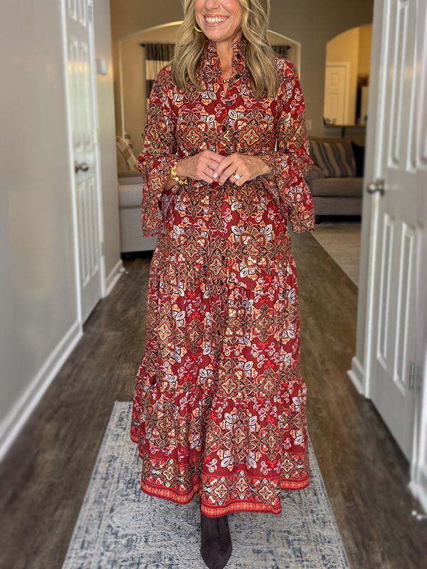 Exquisite Pleated Printed Chiffon Bell-Sleeve Maxi Dress