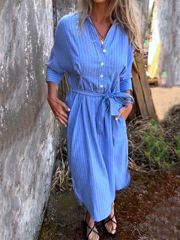 NEW🔥 Striped Lapel Button Down Belt Dress