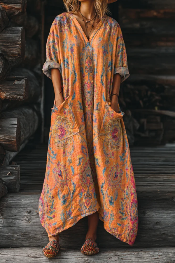 Women's Retro Ethnic Totem Art Pattern Print Pocket V-neck Cotton Dress