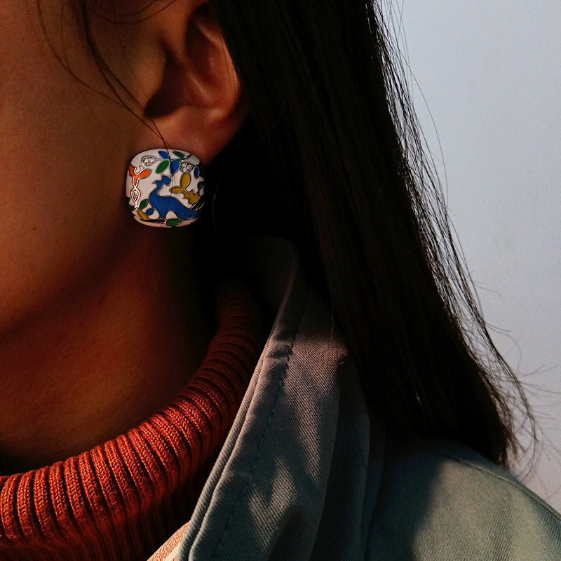 Enamel Flower and Bird Earrings Multicolored Enamel Square Earrings