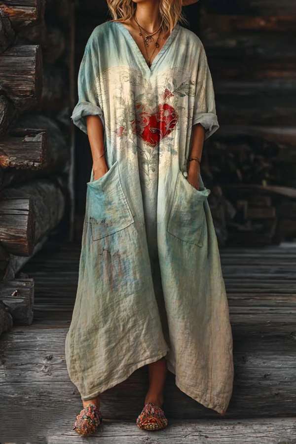 Women's Vintage Heart Pattern Artistic Print Pocket V-Neck Cotton Dress