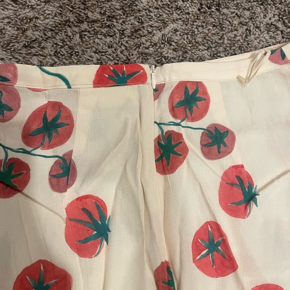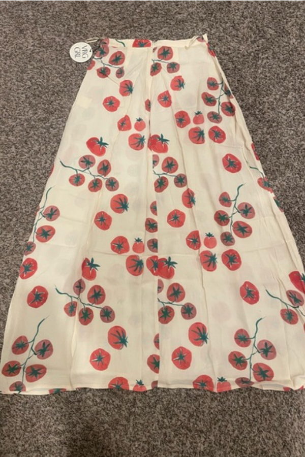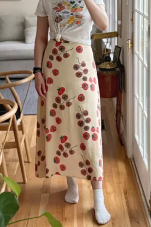 Details The high waistline elongates the legs, while the A-line skirt drapes naturally, perfectly concealing wide hips and leg imperfections, making it flattering for pear-shaped and apple-shaped figures. It flows gracefully with every step. A concealed side slit adds freedom of movement and subtly reveals the leg line, breaking the monotony of a long skirt and adding a touch of sexiness. The hand-painted tomato pattern, with its bright colors and playful design, evokes a "summer picnic" feel, making it a highly recognizable and eye-catching element on social media, easily creating a "food-themed outfit" trend.