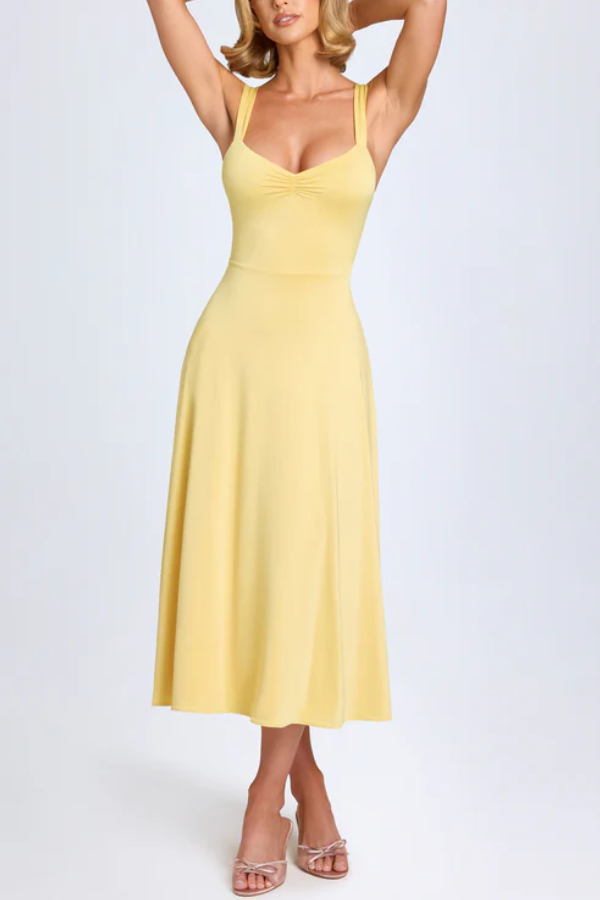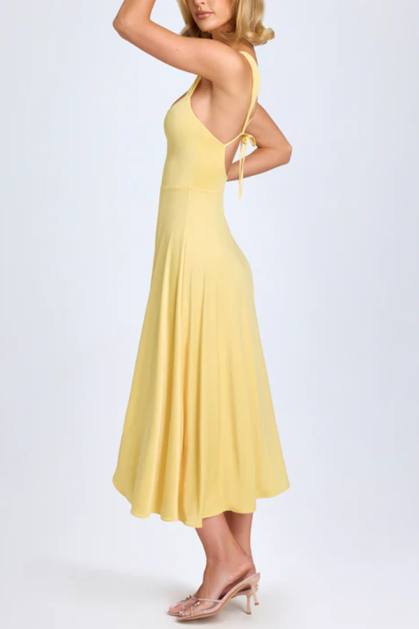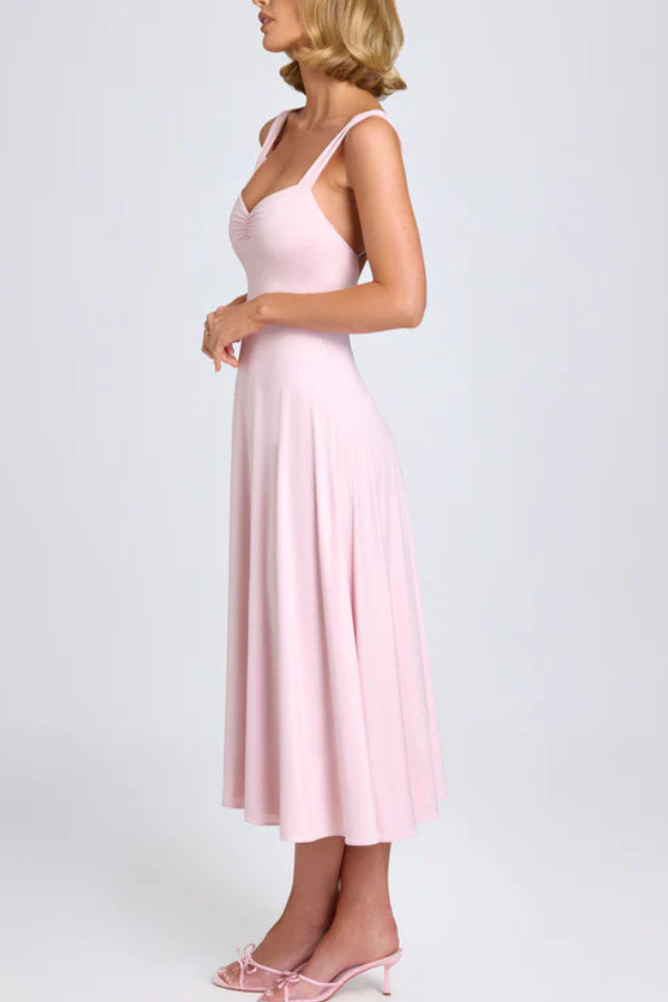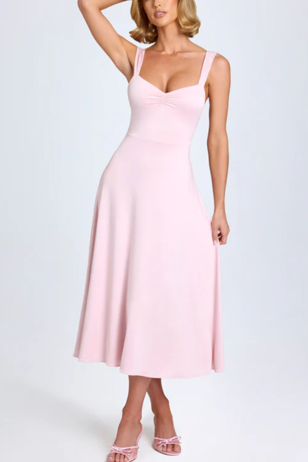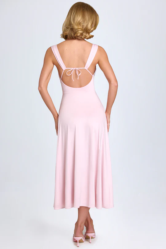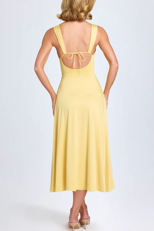 The sweetheart neckline with a central knot design visually enhances the bust and flatters the figure, while also elongating the neck for a swan-like silhouette. Widened shoulder straps distribute weight evenly, preventing pressure marks and concealing sloping or narrow shoulders. The deep U-shaped open back with a tie detail ensures both sexiness and adjustable fit. A high waistline connects to a flowing A-line skirt that reaches mid-calf, creating a sense of movement and perfectly concealing wide hips and leg imperfections.