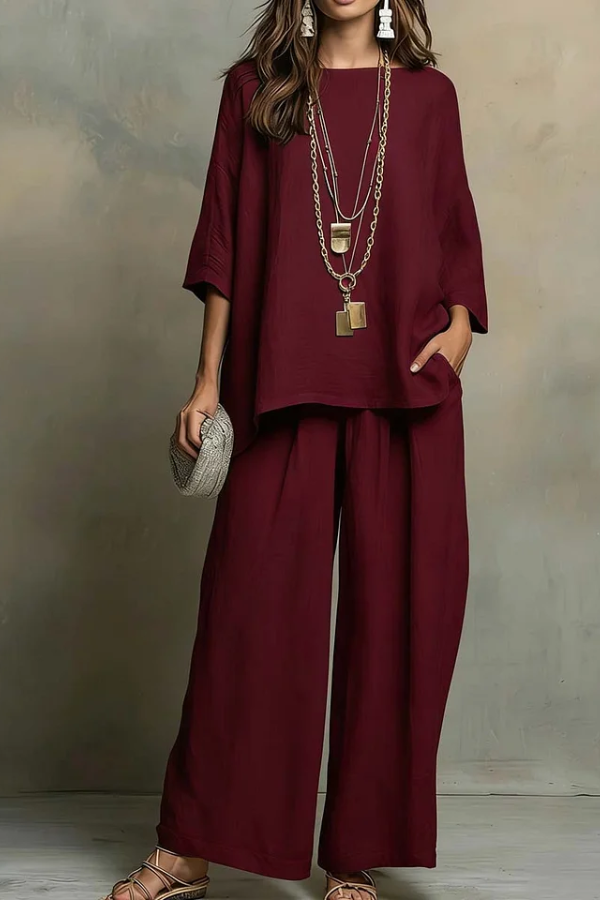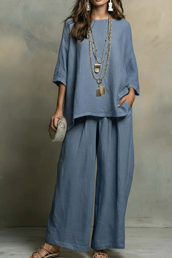 Details The top features a dropped shoulder, cocoon-shaped design, while the pants are ultra-wide-legged. The entire outfit uses a "straight up and down" tailoring logic to minimize the appearance of flaws in the waist, abdomen, hips, and legs, making it extremely flattering for slightly overweight, pear-shaped, and apple-shaped figures. The sleeve length perfectly covers the thickest part of the arms, balancing sun protection with a slimming effect. It can be worn as an inner layer in spring and autumn, or on its own in summer, making it versatile for various seasons. The pockets on both sides of the pants are a highlight, not only enhancing practicality but also adding a relaxed feel to the overall look when hands are in pockets, a key detail that improves the user experience.