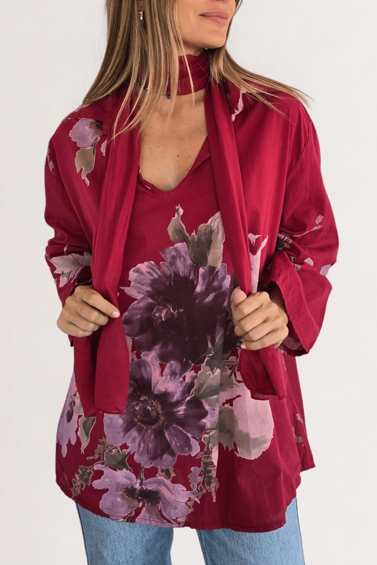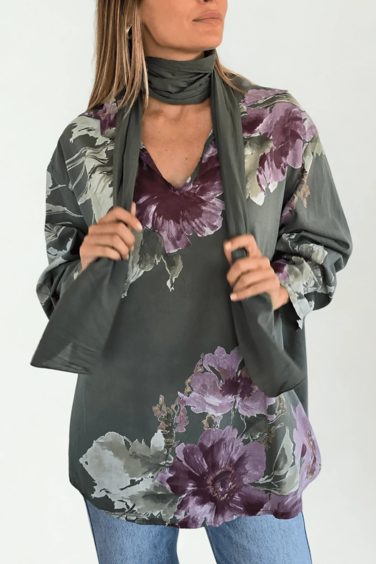 This artistic tunic and scarf set is a wearable masterpiece: a soft blue base adorned with dreamy watercolor floral prints in rich plum and sage tones, paired with a matching sheer scarf for endless styling possibilities. The relaxed, flowy silhouette and lightweight fabric make it perfect for layering over jeans (like shown) or as a standalone piece for brunch, gallery visits, or casual outings.
