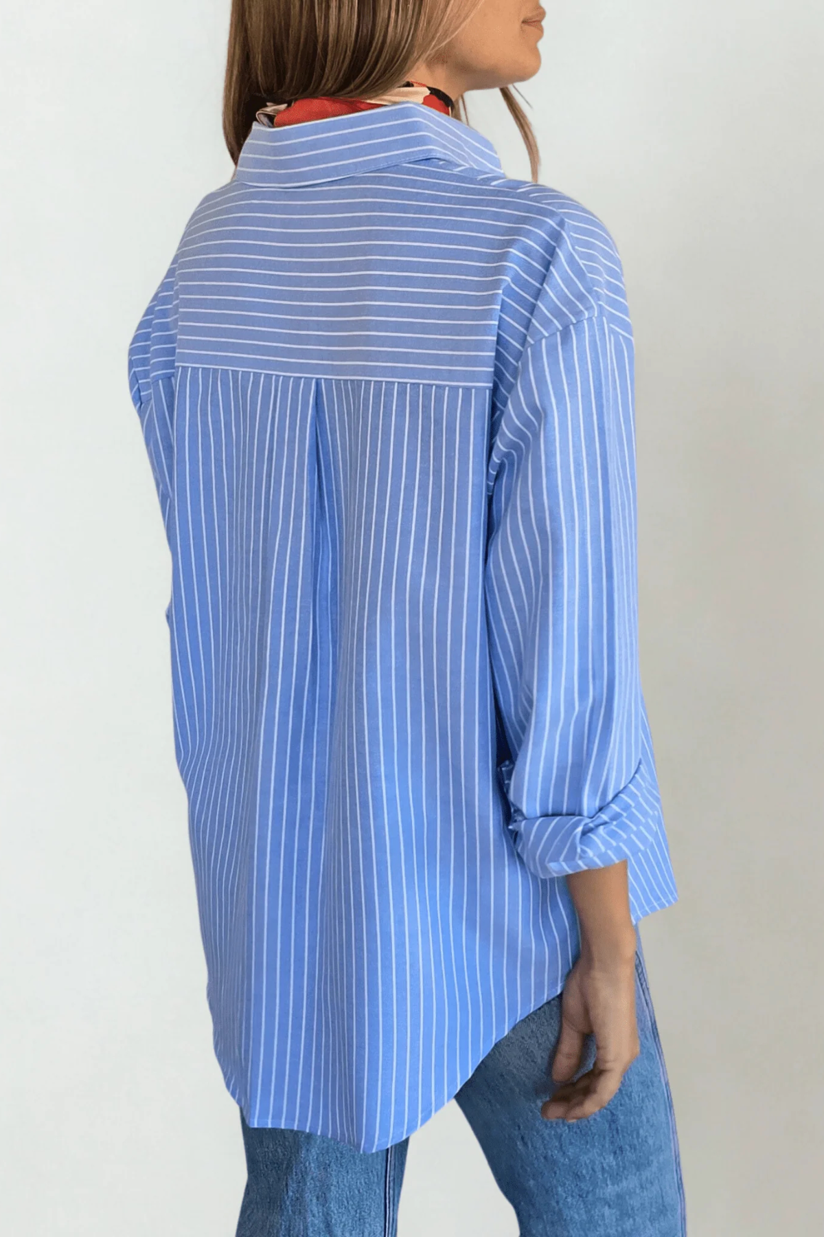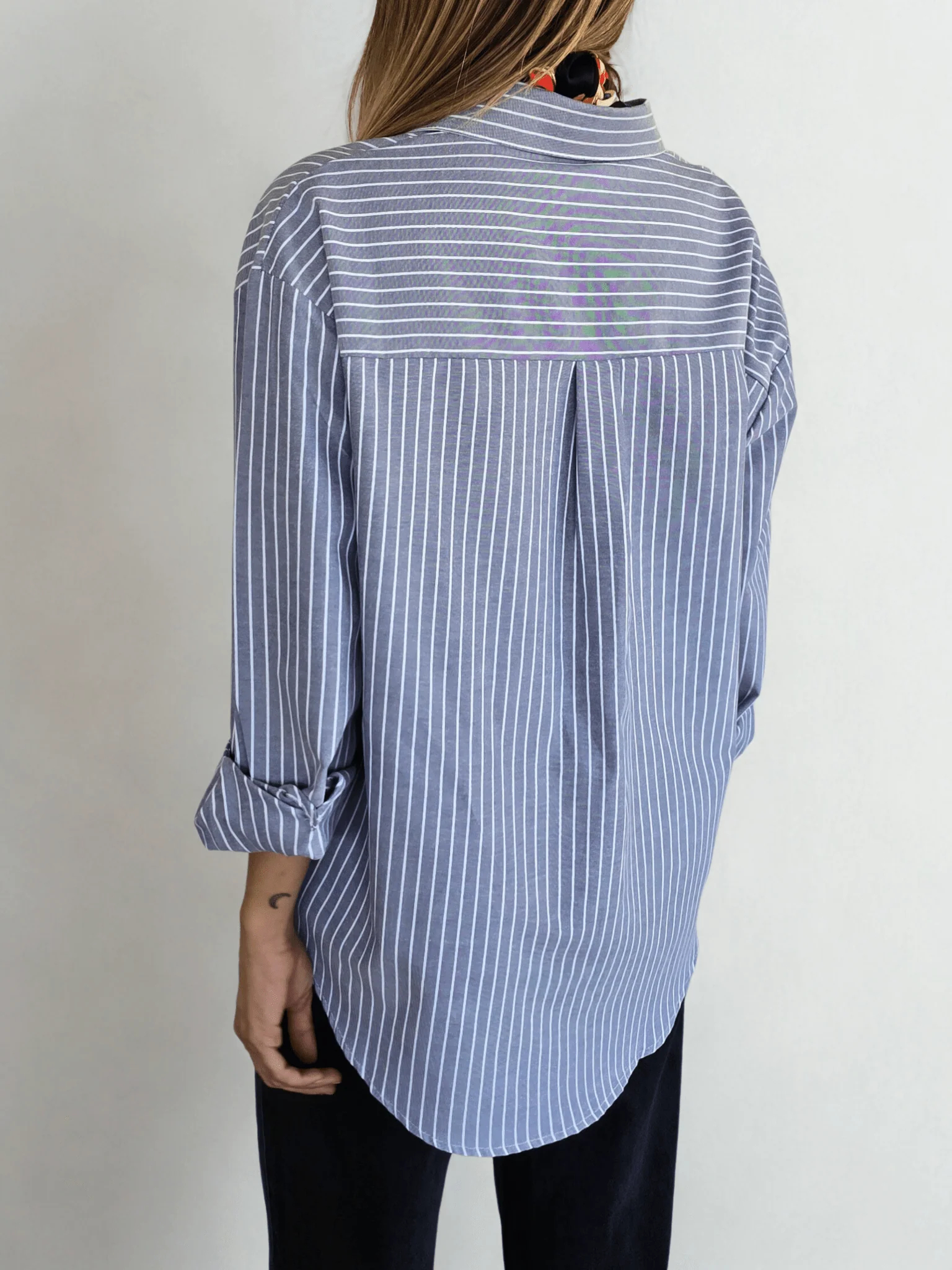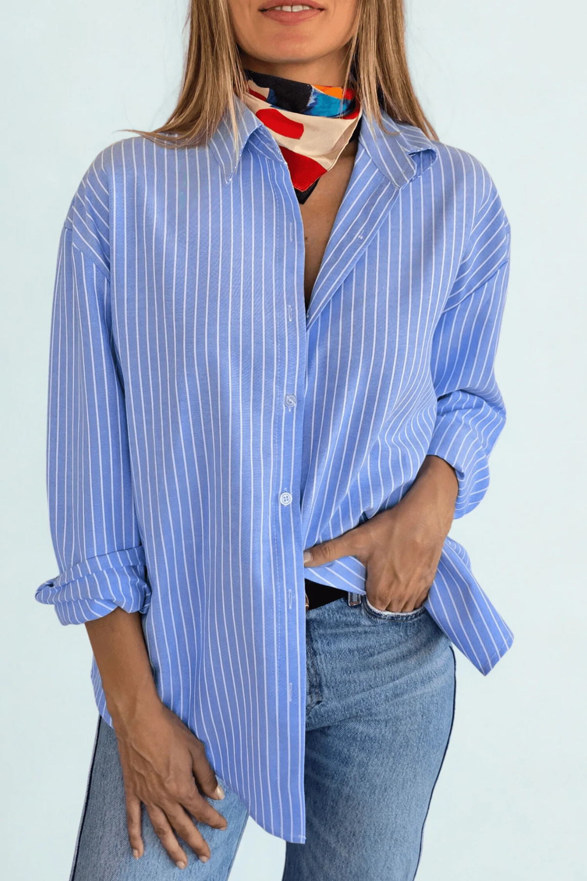 This classic striped shirt is a wardrobe essential. Crafted from lightweight, flowy fabric, it features a relaxed oversized fit, a crisp collared neck, and button-front closure for effortless style. The rolled-up sleeves add a casual touch, making it perfect for pairing with jeans (as shown) or dressing up for a polished look.