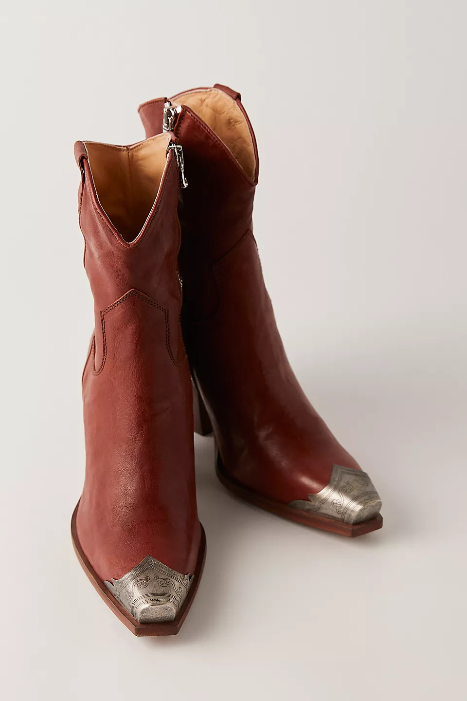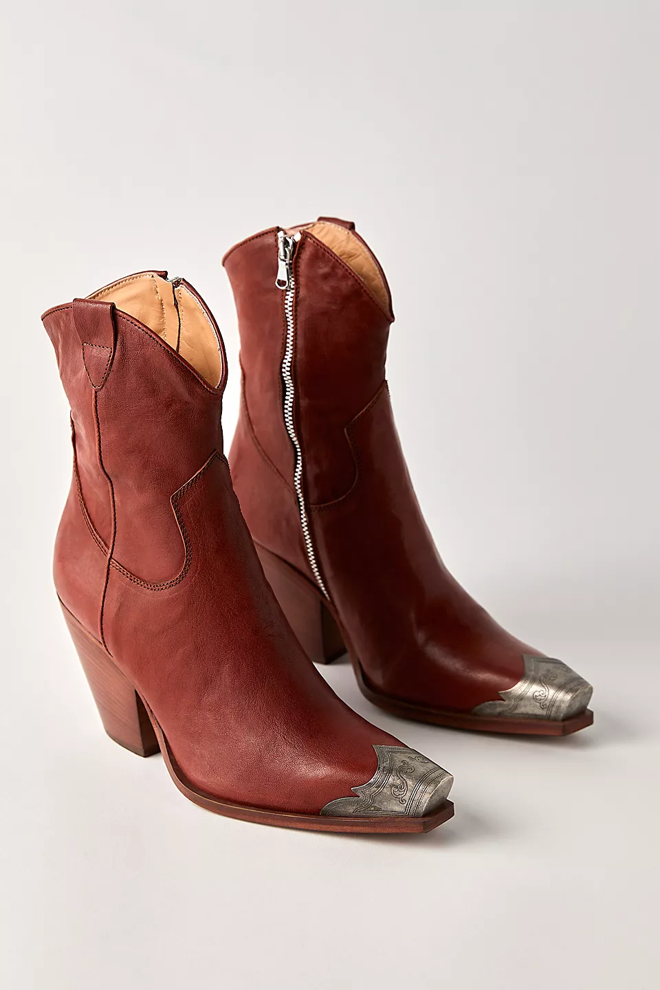Gorgeous Italian-crafted leather boots featured in a western-inspired style with an etched metal toe, slim sit and stacked heel.
