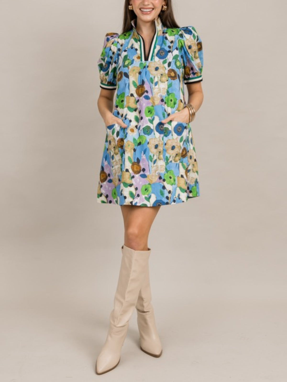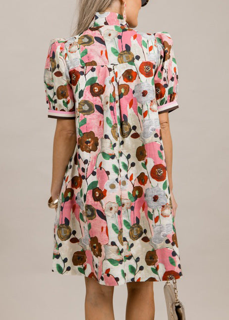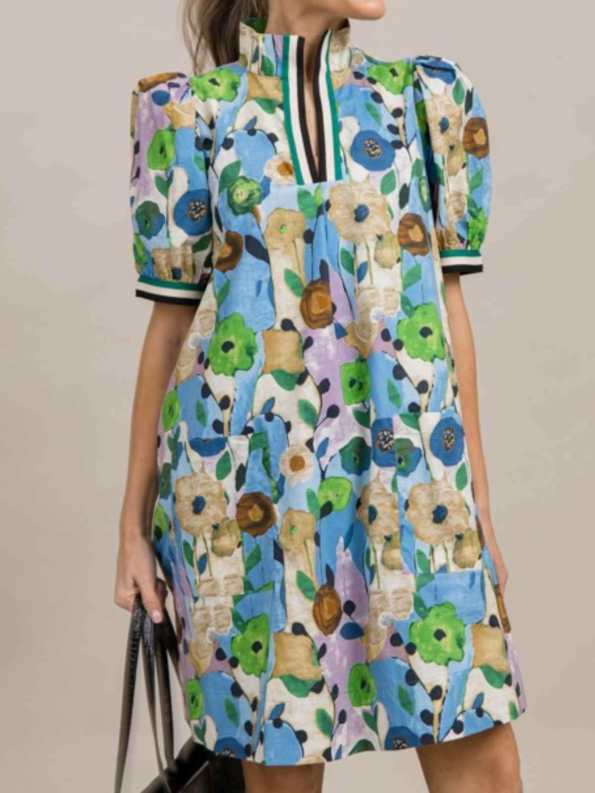 We're carrying our flirty floral style right into fall with this cute new dress. A pink, ivory, and brown stripe band trims the neckline and sleeves, creating a chic and modern look. The fit flows effortlessly on the body thanks to strategically placed pleats on the center of the front and back. Dress features a standing collar, puff sleeves, and patch pockets. Pair it with anything from sneakers to boots!