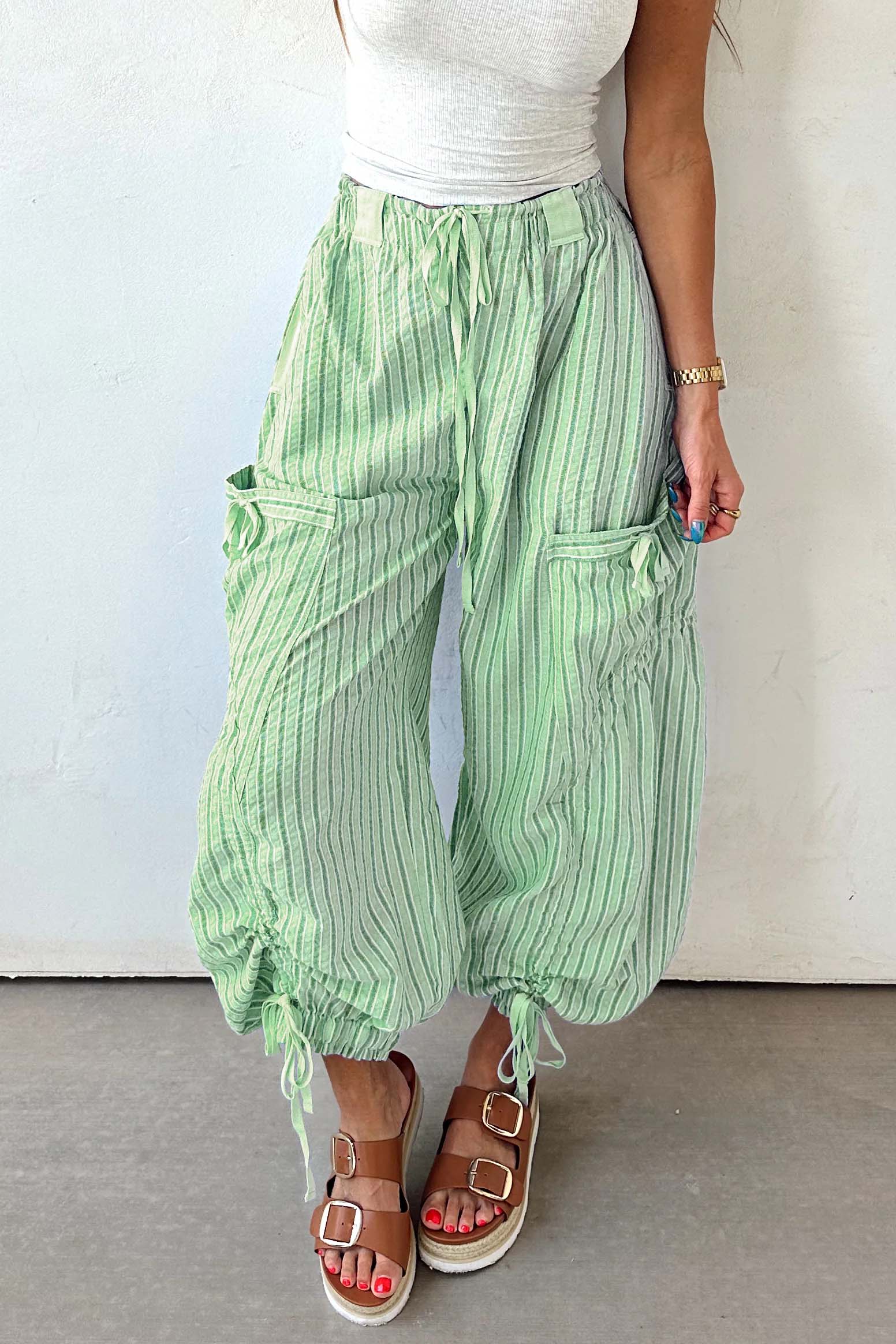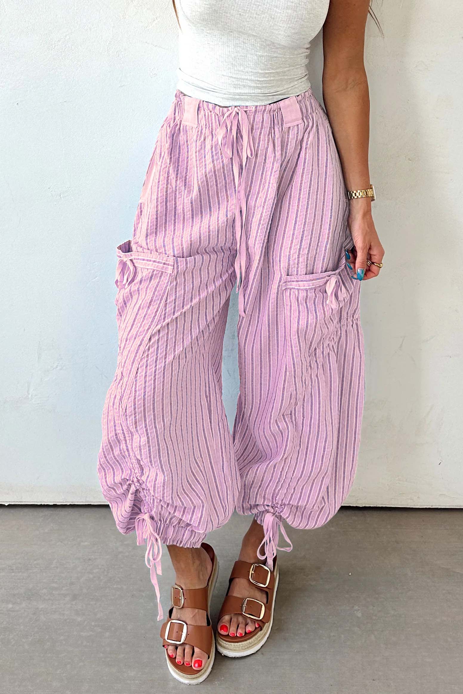 Easygoing never looked so good. These breezy striped pants are made for morning markets, lazy beach strolls, or just lounging in style. With their ruched leg detail, cargo-inspired pockets, and relaxed fit, they’re your summer staple with a twist.
