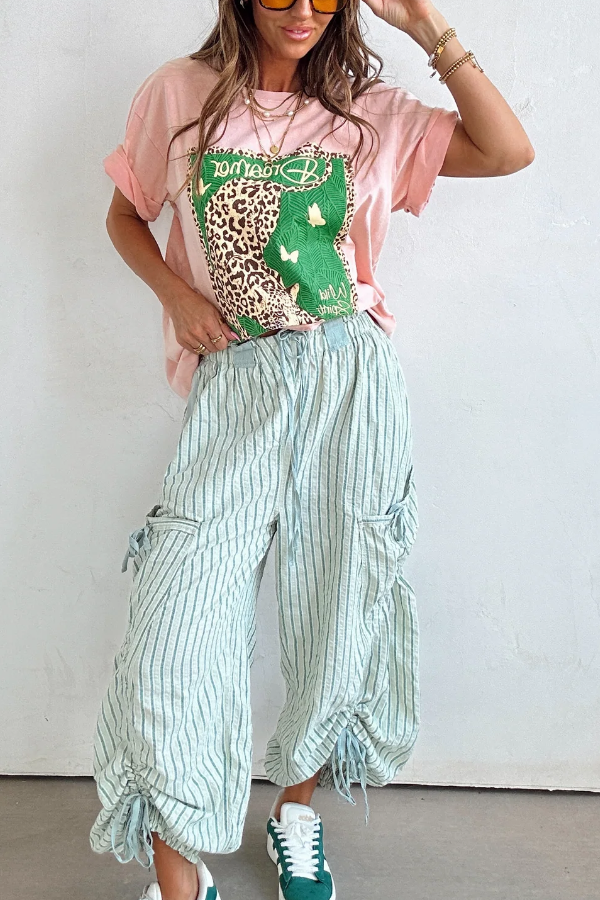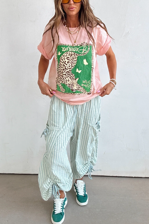 Bring out your wild side with this bold and playful graphic tee. Featuring a fierce leopard surrounded by tropical greens and butterflies, this soft pink tee adds the perfect pop of personality to your casual look. Easy to style and effortlessly cool, it’s a must-have for everyday wear.